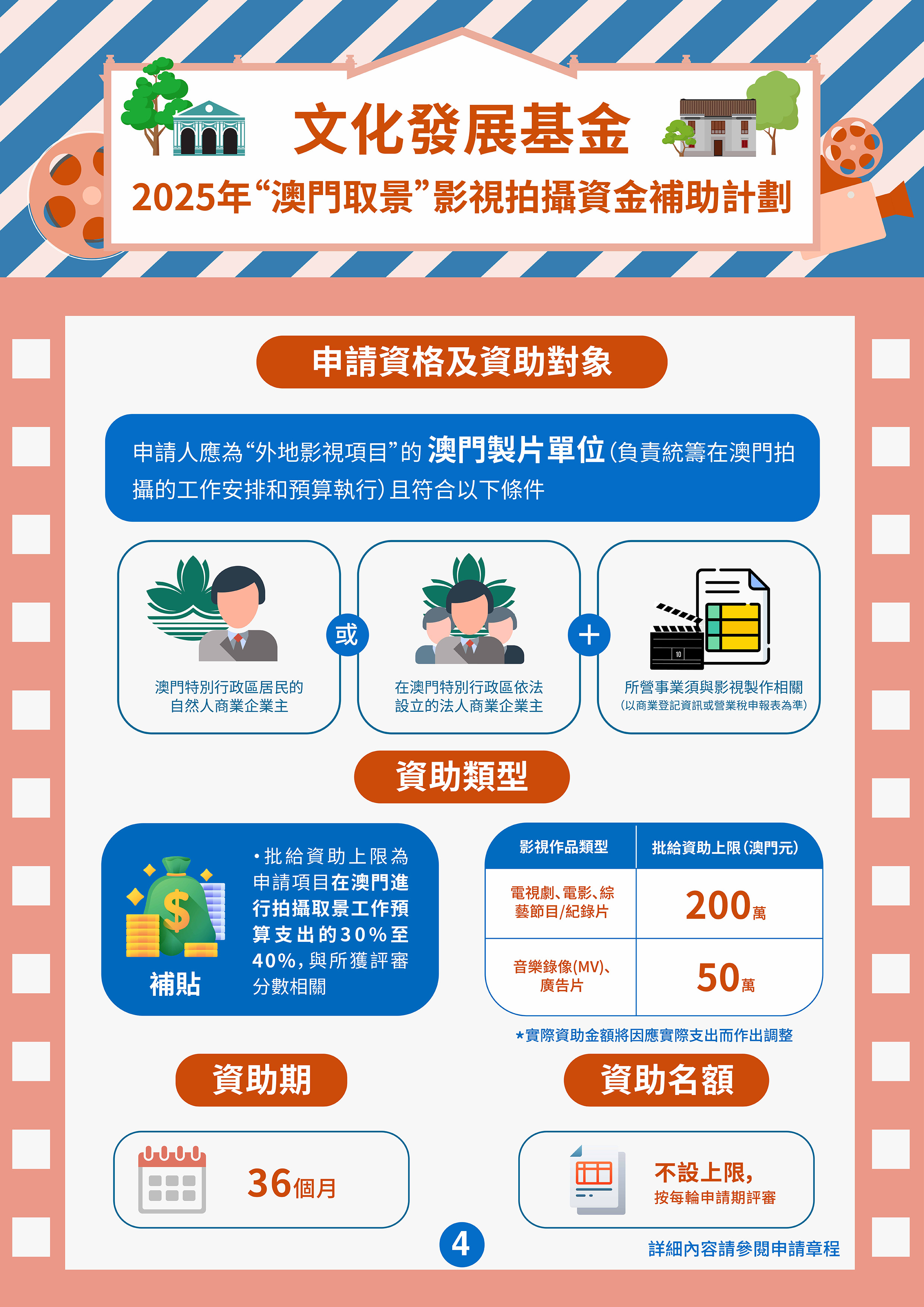 今年將推出四輪申請,第一輪申請期由2025年2月28日至3月31日,倘預算使用完畢,則申請期提早結束。資助計劃接受在確認提交申請日前尚未開展在澳門取景拍攝工作,且在澳拍攝的日數不少於3天的外地影視項目,由外地拍攝團隊主導並來澳參與拍攝工作。資助申請須由作為澳門製片單位的澳門商業企業主提出,其所營事業須與影視製作相關。獲資助的影視項目須在資助期內完成公開播放,且公映版本的片長及片中出現澳門取景地點的時長,須符合章程規定的時限要求。