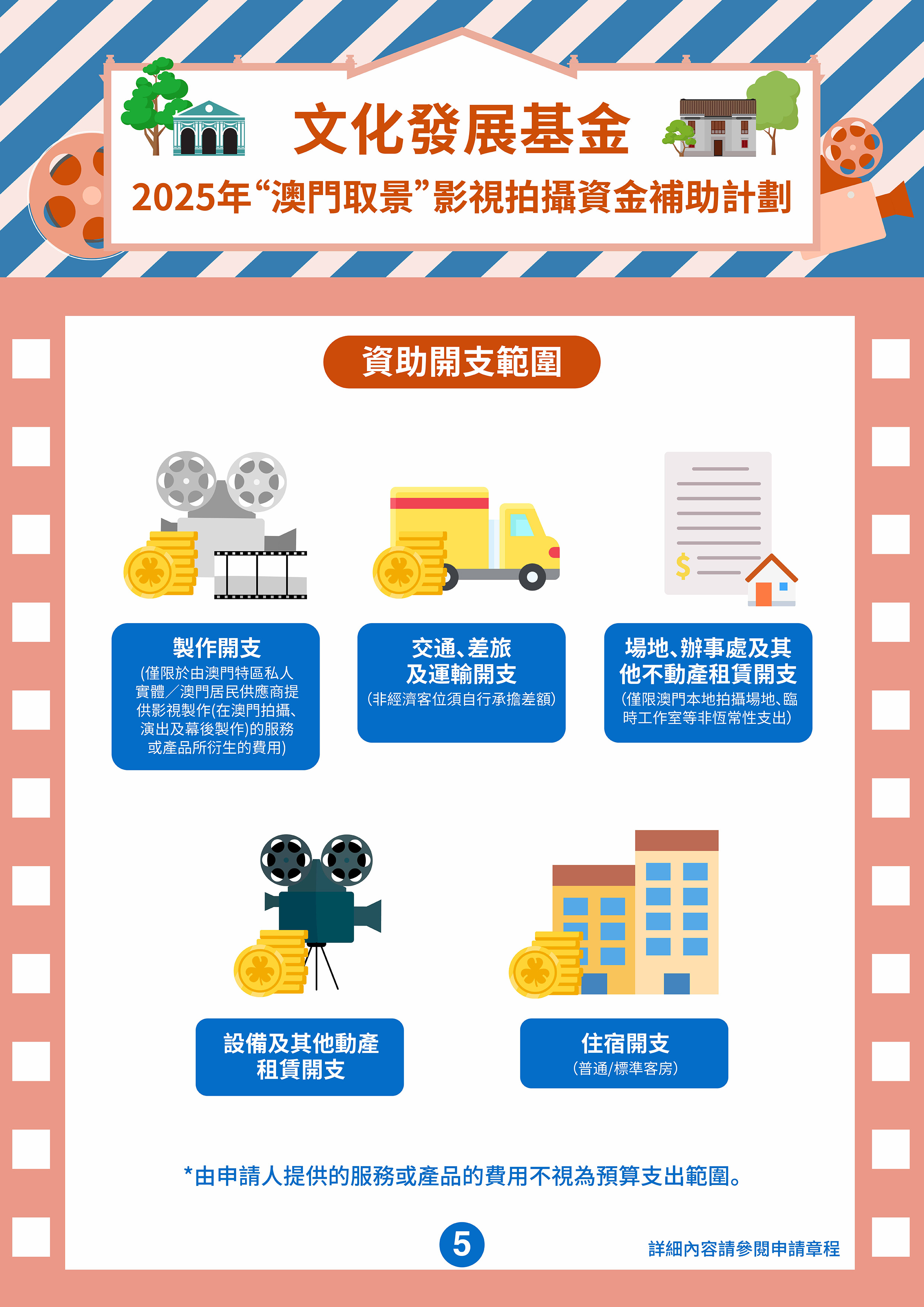 文化發展基金繼續推出“澳門取景”影視拍攝資金補助計劃,鼓勵外地拍攝團隊到澳門實地取景拍攝,通過影視作品宣傳澳門城市形象及提升國際知名度,帶動文創及旅遊的聯動性,推動澳門影視產業發展。