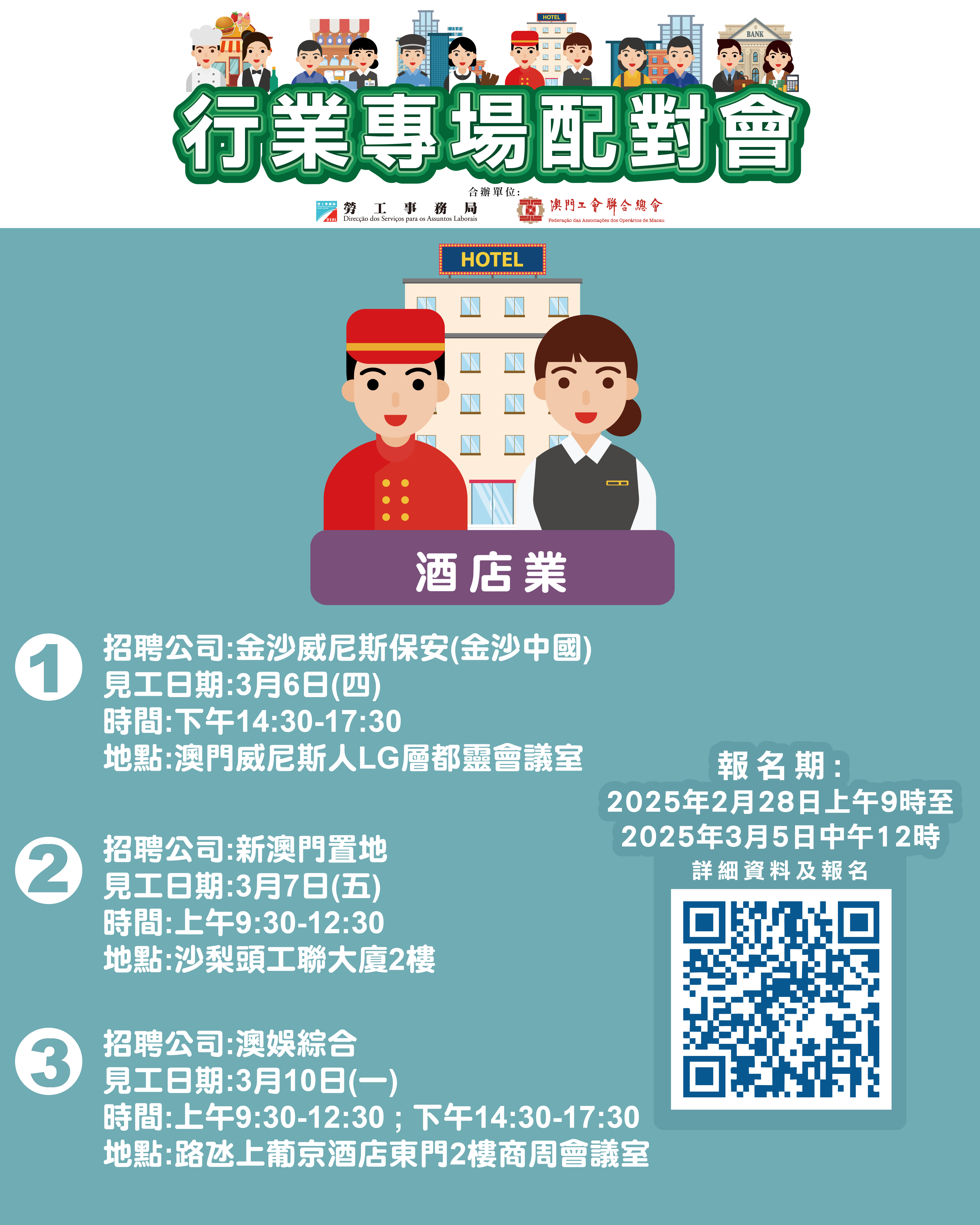 3月6日下午酒店業配對會在澳門威尼斯人LG層都靈會議室舉行;3月7日上午酒店業專場配對會在澳門工會聯合總會二樓(沙梨頭海邊街2-6號工聯大廈)舉行;3月10日全日酒店業配對會在澳門上葡京二樓商周會議室舉行。報名日期為2月28日上午9時至3月5日中午12時。
