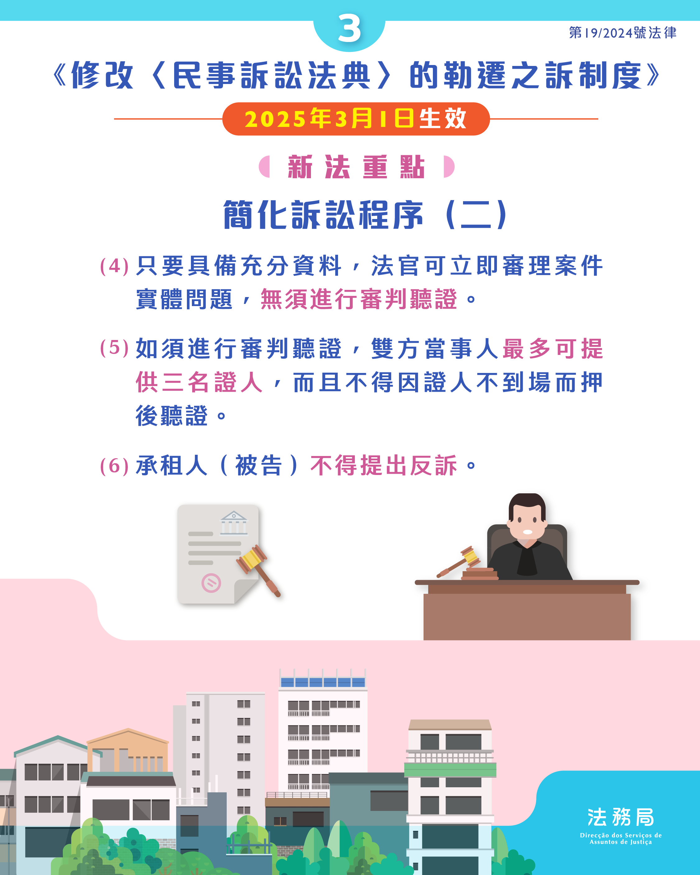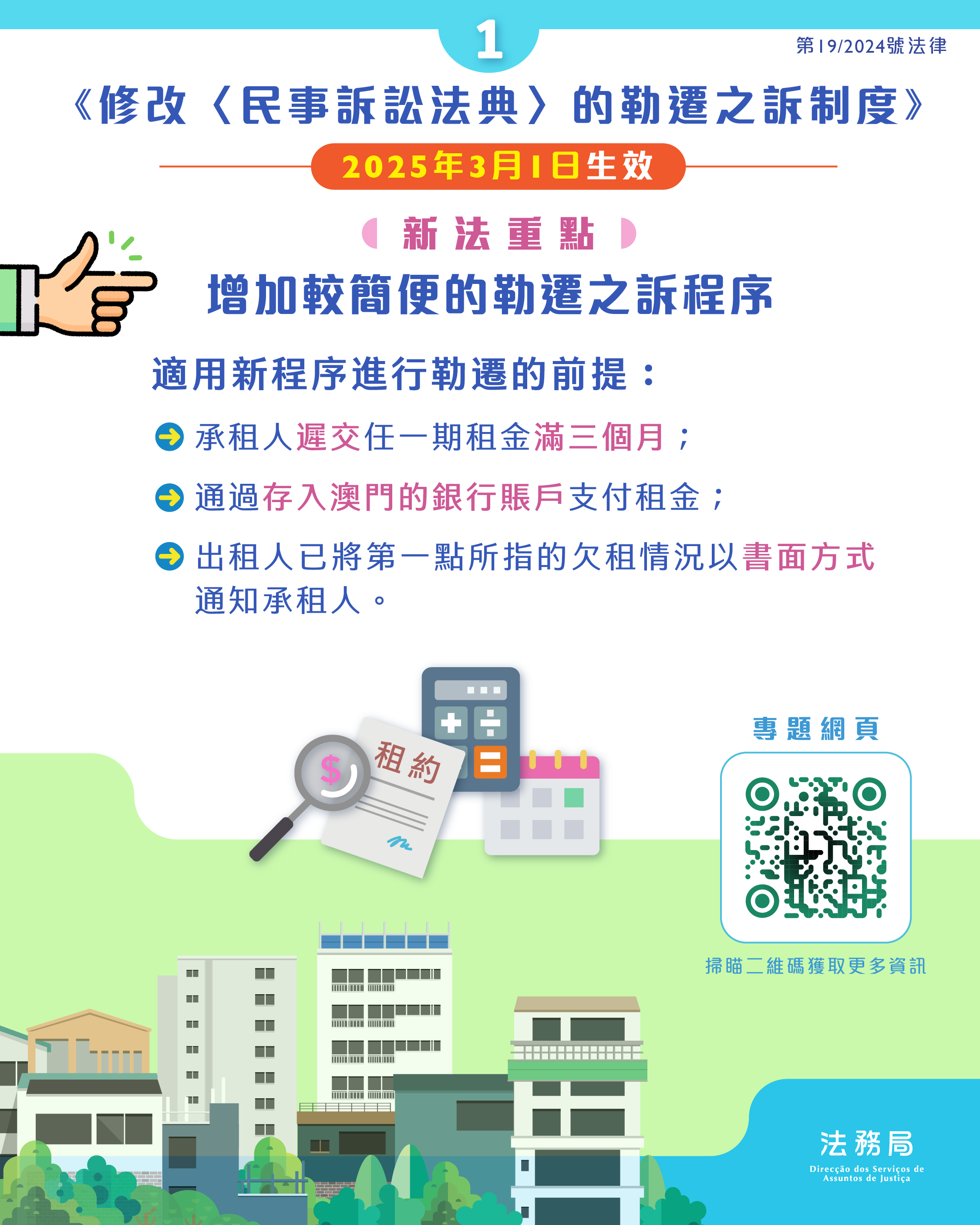 第19/2024號法律《修改〈民事訴訟法典〉的勒遷之訴制度》將於明(1日)生效,在原勒遷之訴基礎上,“新勒遷制度”針對長時間欠租情況,增設更簡單快捷的勒遷之訴新程序,簡化訴訟流程,並新增在特定情況下將承租人列入查閱資料的機制,有利於針對長期拖欠租金的租霸問題,業主能有效地收回被霸佔的單位。