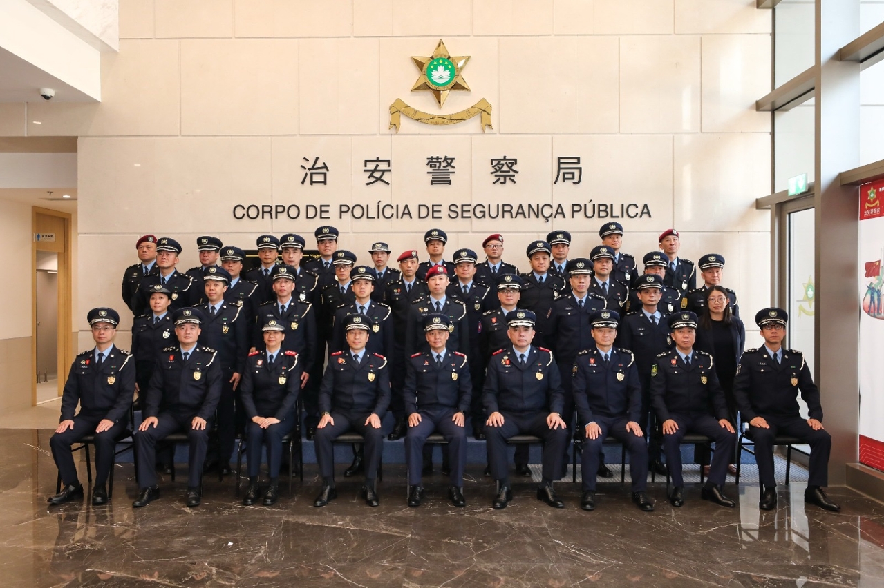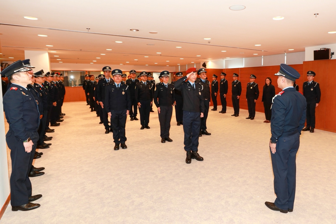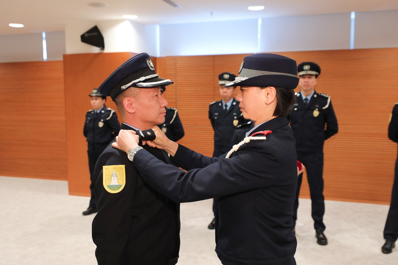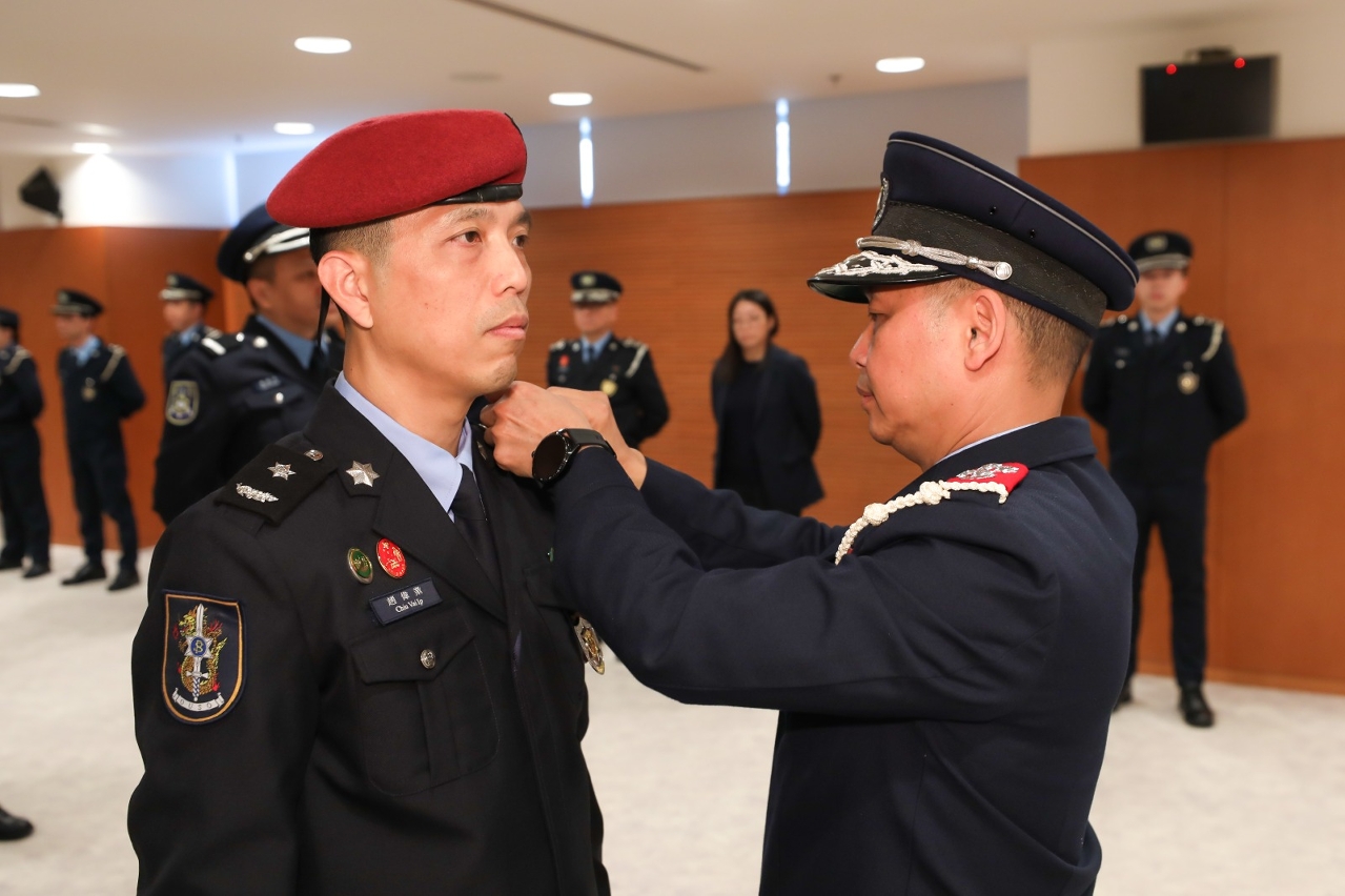 今(28)日上午,治安警察局在總部大樓舉行警長晉升儀式,儀式由吳錦華局長主持,黃偉鴻副局長、梁慶康副局長、伍素萍副局長及各部門主管出席儀式。儀式上,各位晉升的警長正式戴上新的肩章,標誌着晉升人員肩負起更大的責任與使命。