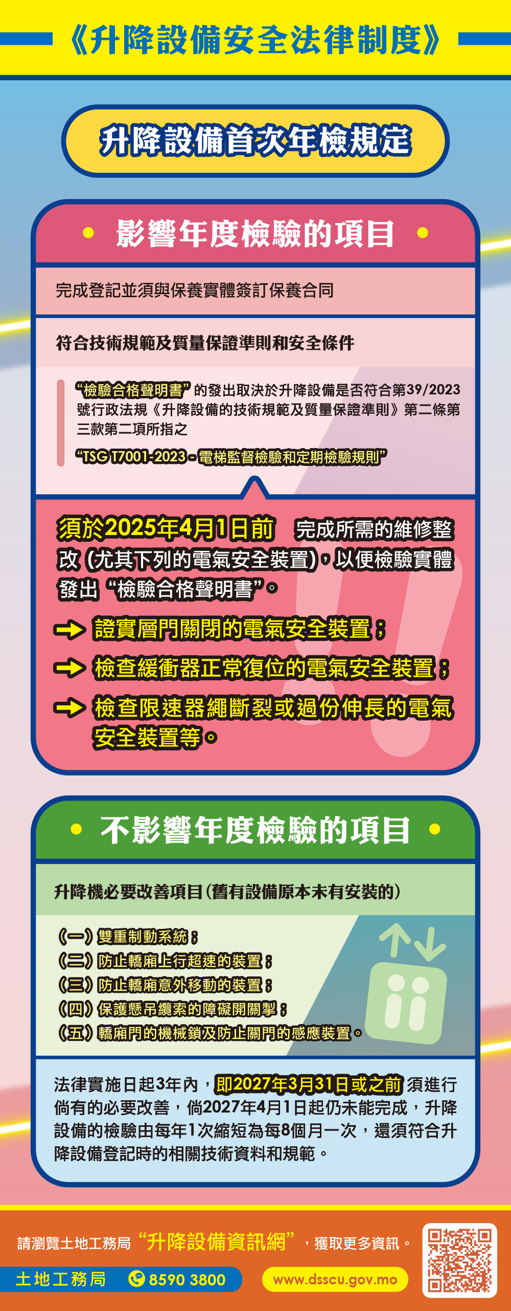因應第14/2022號法律《升降設備安全法律制度》已於2024年4月1日起全面生效,根據規定,升降設備在完成登記後,須由檢驗實體進行每年最少一次的檢驗,以取得檢驗合格聲明書。責任人必須留意影響年度檢驗的項目,包括:為升降設備完成登記、與保養實體簽訂保養合同,以及符合相應技術規範及質量保證準則和安全條件。按照規定,檢驗合格聲明書的發出,取決於升降設備是否符合第39/2023號行政法規《升降設備的技術規範及質量保證準則》所指的“TSG T7001-2023—電梯監督檢驗和定期檢驗規則”(下稱“檢驗規則”)。