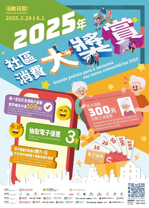 由特區政府與商會合辦的“2025年社區消費大奬賞”大型促消費活動將於3月24日至6月1日期間進行。為關顧長者,是次活動在過往手機支付消費後抽取電子優惠的基礎上,額外提供“長者消費立減優惠”,年滿65歲的長者在活動期間可憑新版“澳門通長者卡”拍卡領取總額300元的消費立減優惠。