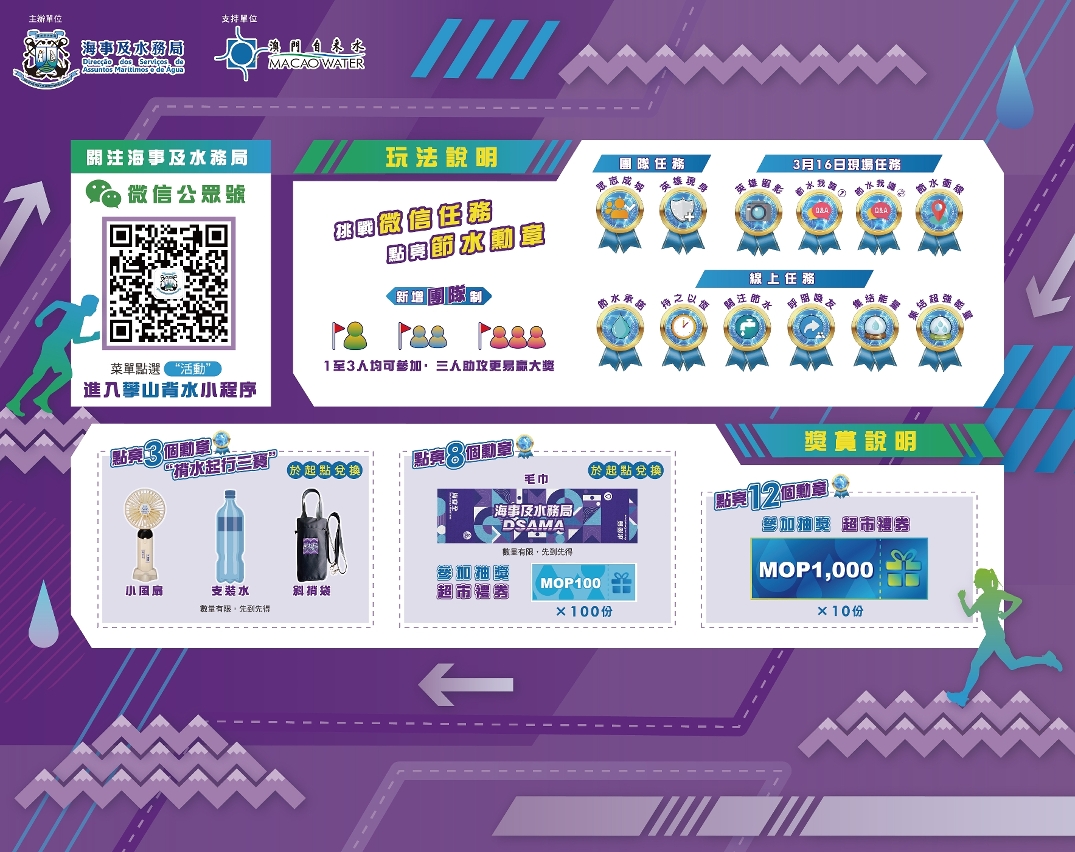 活動無需報名預約,可即場參與。市民亦可事先透過海事及水務局官方微信“2025攀山背水小程序”參與線上節水挑戰,小程序設有團隊制,1 至 3 人均可參加,3人組隊合作更容易完成任務,在小程序點亮三個“節水勳章”,就能於3月16日下午三時至六時到活動現場換領“節水三寶”(含斜揹袋、支裝水及小風扇);此外,市民於現場完成揹水體驗和指定任務,點亮八個“節水勳章”,還可換領一條精美毛巾和參加抽獎,點亮12個“節水勳章”,更可參加終極大抽獎,抽獎獎品十分豐富,共有110份超市禮券。