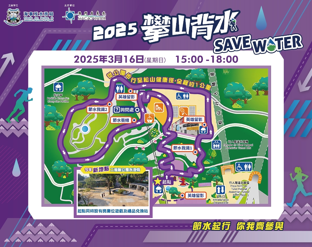 為響應世界水日,提升市民珍惜水資源的意識,海事及水務局將於3月16日(星期日)下午三時至六時,在二龍喉公園舉辦“2025攀山背水”體驗活動。活動旨在讓市民體驗缺水地區人民攀山越嶺取水的艱辛,明白澳門食水來之不易,從而珍惜點滴、節約用水。