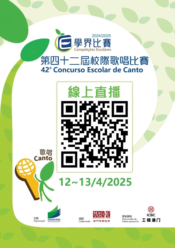 為促進學生的多元發展,發揮學生的潛能以及提升不同領域的藝術水平,並加強各學校間的音樂文化交流,由教育及青年發展局主辦、澳門聲樂協會協辦、中國工商銀行(澳門)股份有限公司獎金贊助的2024/2025學年第四十二屆校際歌唱比賽將於2025年4月12日及13日假澳門大學大學會堂舉行。