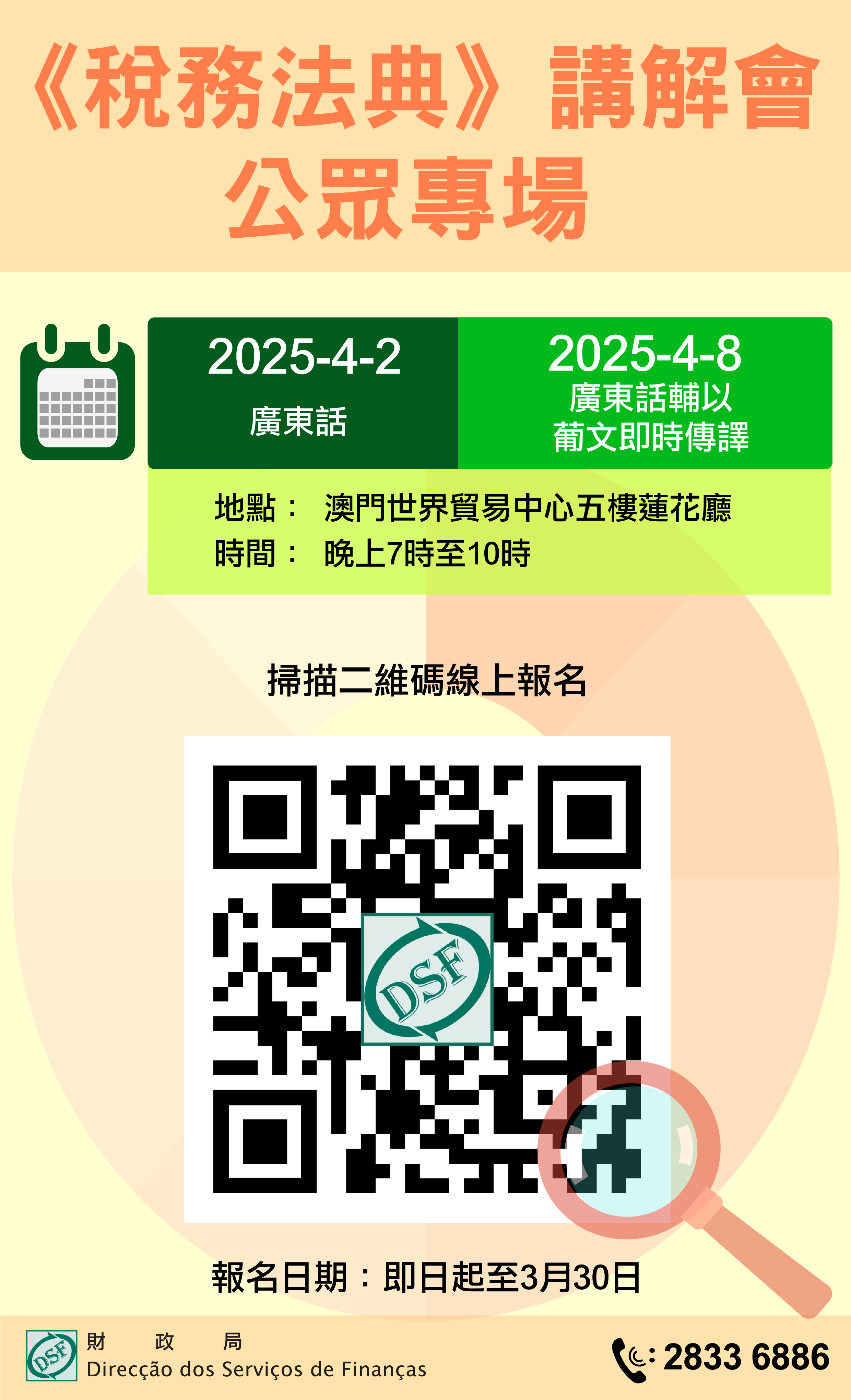 兩場講解會分別訂於2025年4月2日及4月8日晚上7時至10時假座澳門友誼大馬路918號澳門世界貿易中心五樓蓮花廳舉行。第一場講解會以廣東話進行主講、第二場講解會以廣東話進行主講並輔以葡語即時傳譯,歡迎市民由即日起至3月30日透過“稅務法典專題網站” https://cf.dsf.gov.mo 線上報名,每場講解會名額300人,先到先得,額滿即止。