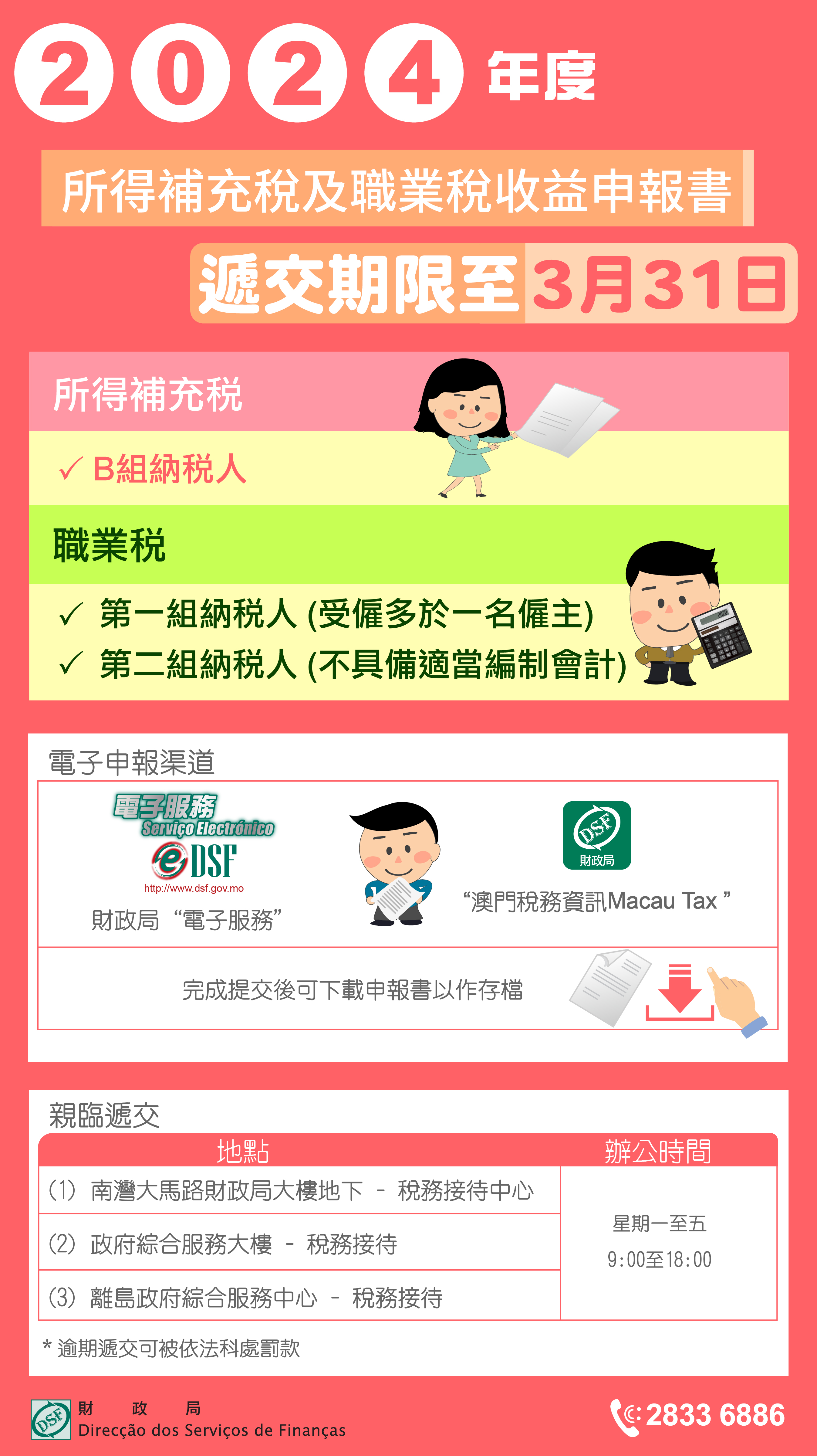 另根據第16/2025號經濟財政司司長批示,倘收益從多於一位僱主處取得的職業稅第一組納稅人,又或不具備適當編制會計的職業稅第二組納稅人,遞交2024年度職業稅M/5收益申報書的期限延至3月31日。