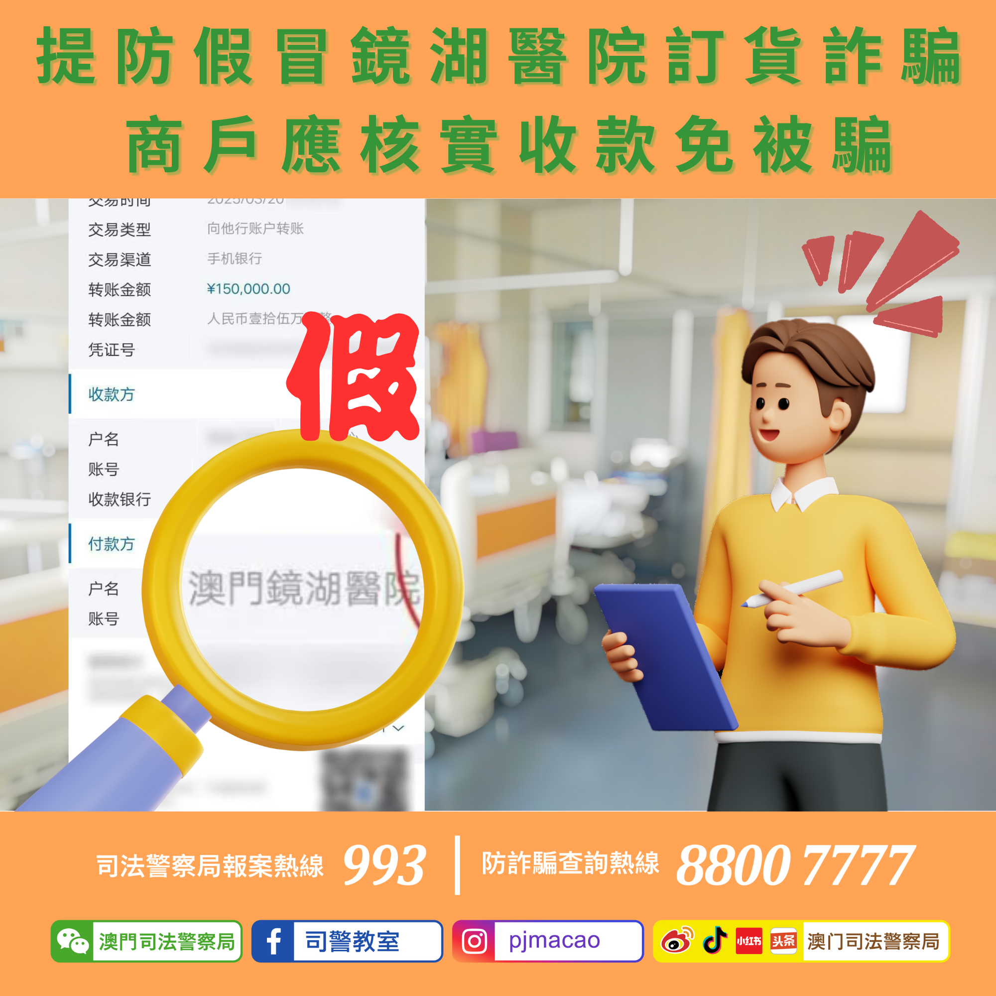 司警局今日發現,有騙徒冒充“鏡湖醫院職員”致電本澳某美容院,聲稱欲訂購大量美容套餐。為博取信任,騙徒向美容院提供虛假的“轉賬截圖”,讓店主誤以為款項已支付。