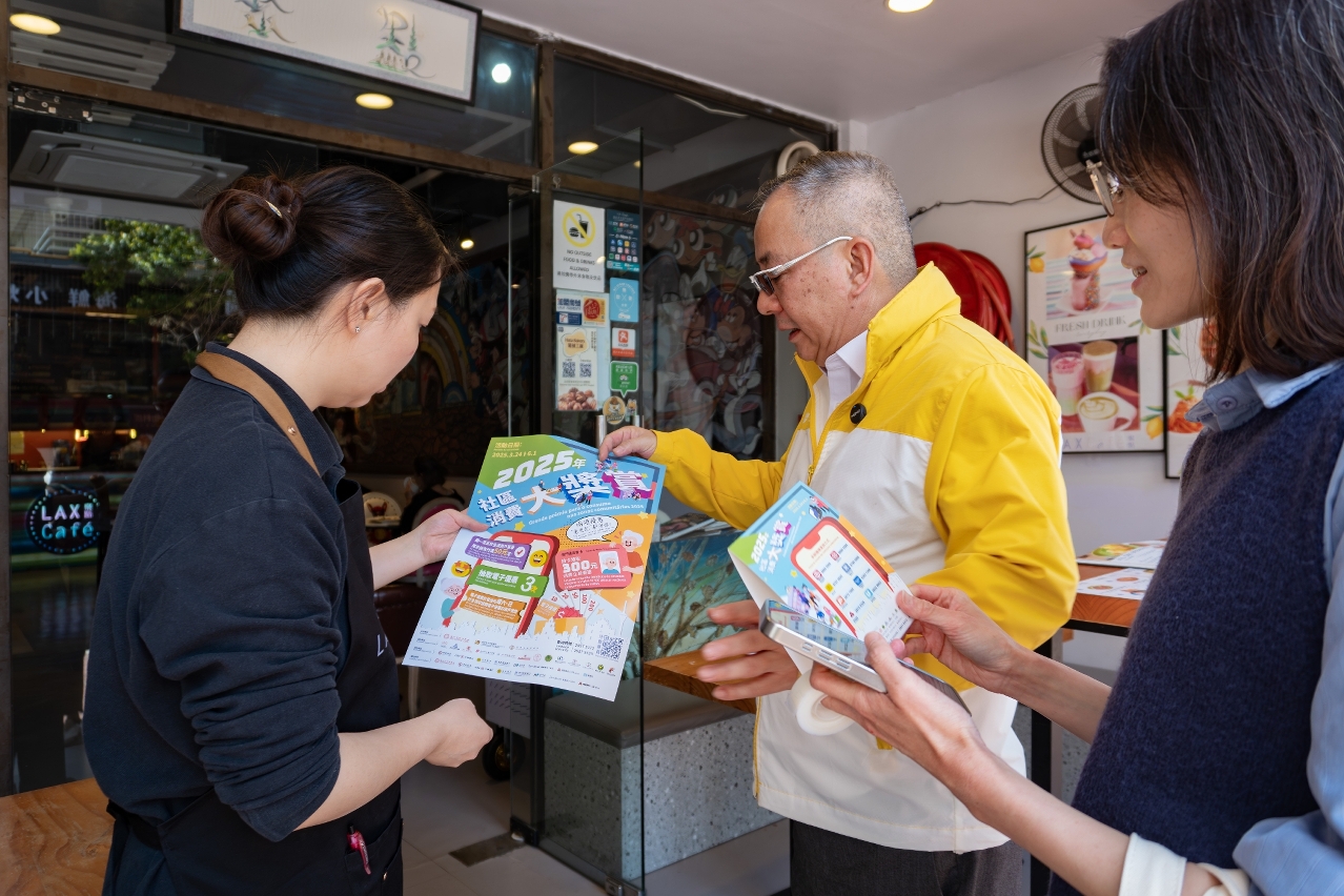 為了讓更多社區商戶了解和支持活動,經科局聯同商會落區向商戶派發宣傳海報,詳細解釋活動內容及參與活動的細節,同時亦推動商戶多配合政府促消費措施,同步疊加推出優惠。