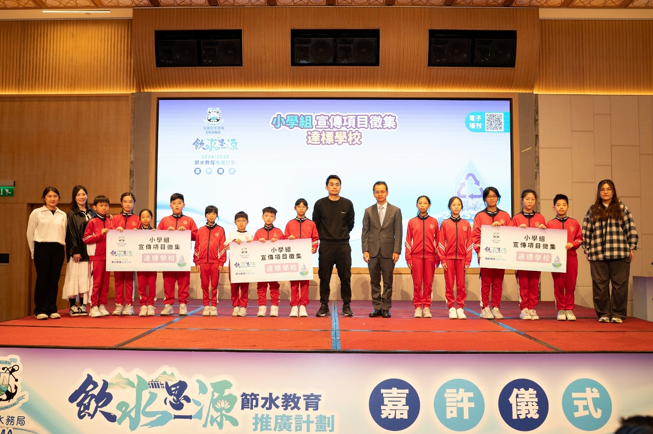 海事及水務局今日(22日)舉行“2024/2025飲水思源節水教育推廣計劃”嘉許儀式,向得獎的學校及師生頒發獎項。