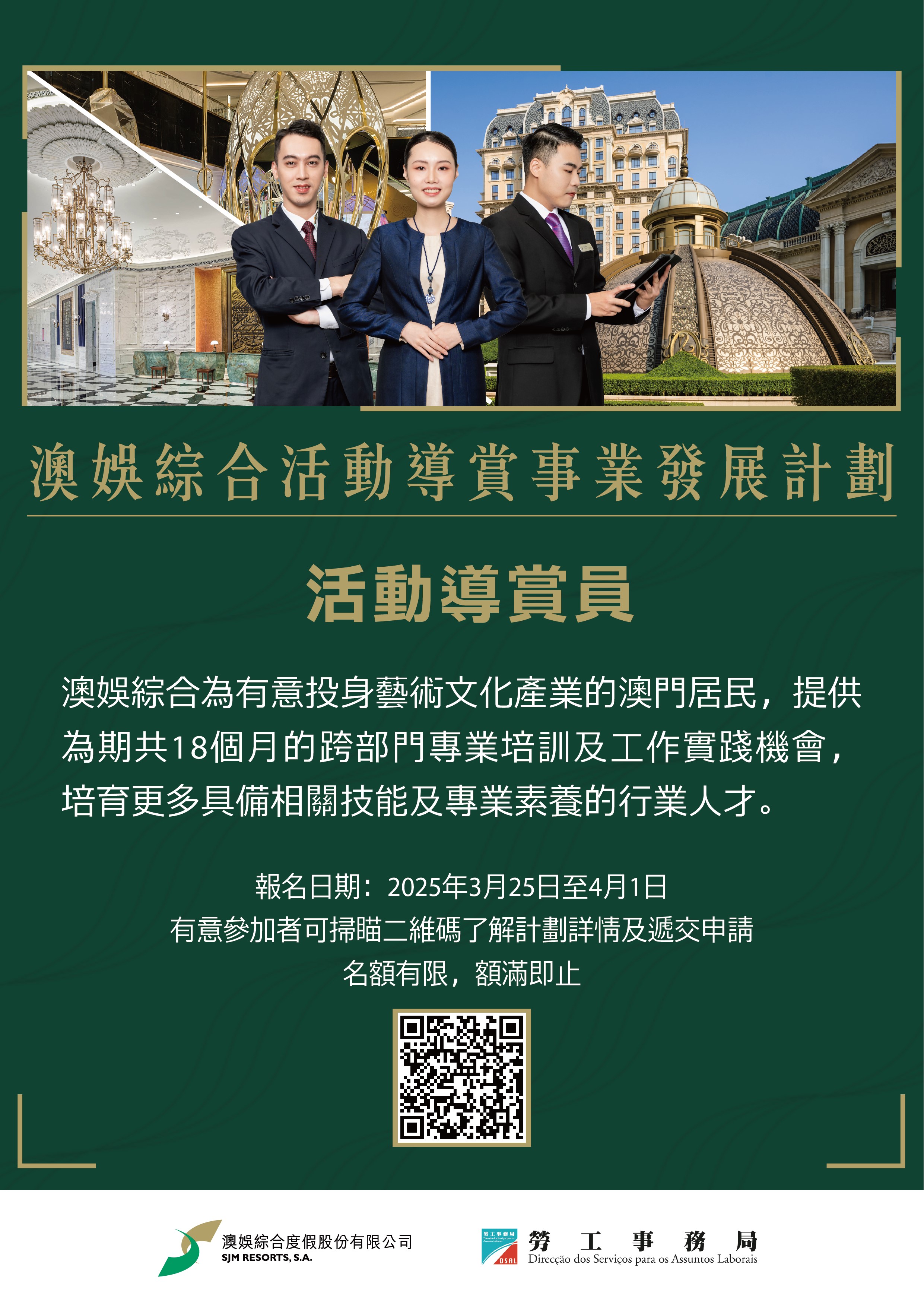 為配合特區政府推動經濟適度多元發展,以及綜合旅遊休閒企業對文化藝術領域的人資需求增加,勞工事務局與澳娛綜合度假股份有限公司(下稱“澳娛綜合”)合作推出“澳娛綜合活動導賞事業發展計劃”(下稱“計劃”),以“先入職、後培訓方式”,為有志投身文化藝術產業的澳門居民提供全方位培訓及事業發展機會,計劃由3月25日起接受申請。