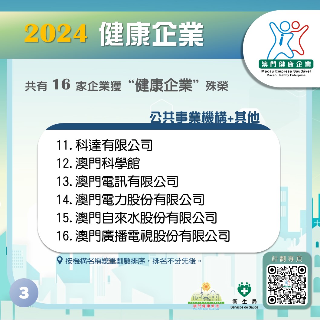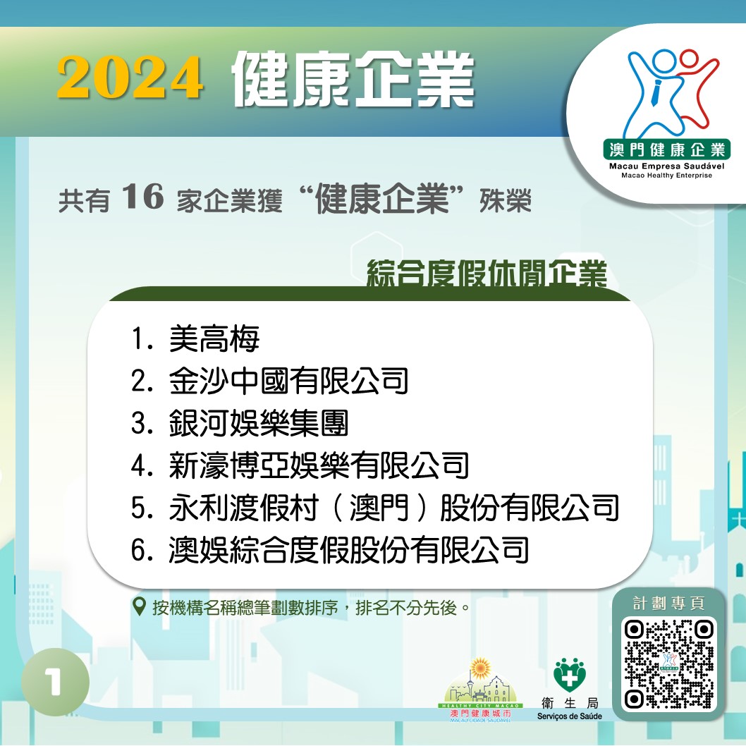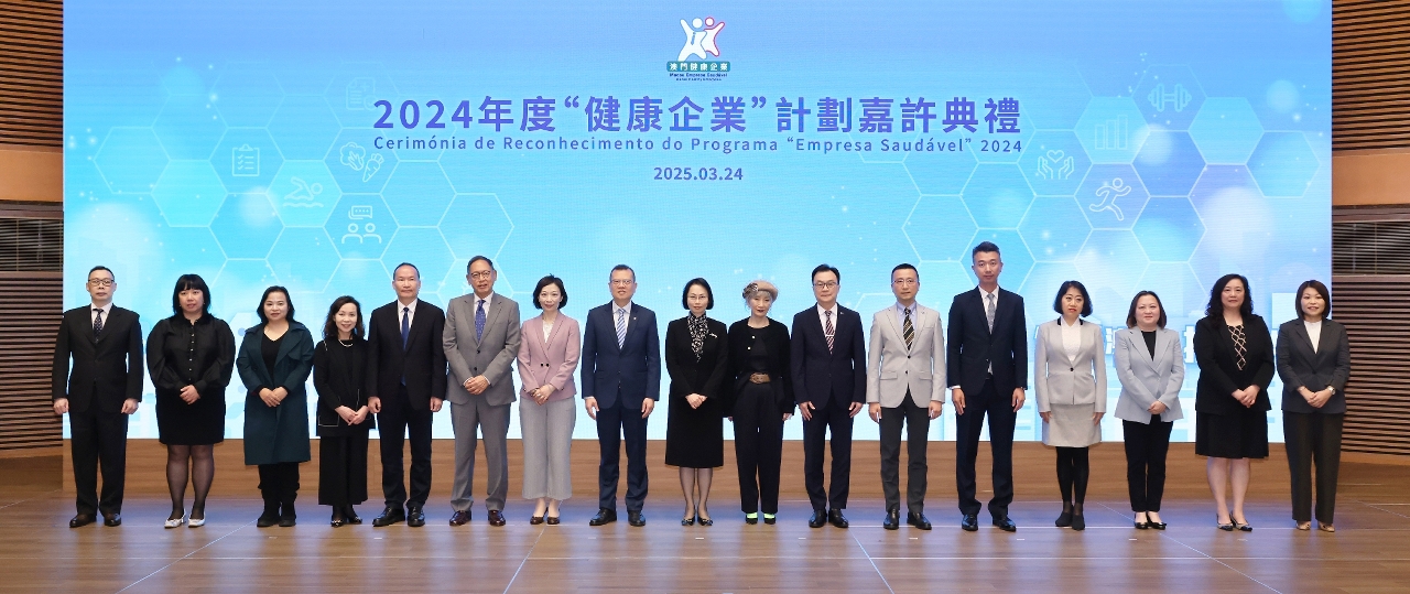 2024年度“健康企業”計劃嘉許典禮於昨(24)日圓滿舉行,健康城市委員會主席、社會文化司司長柯嵐,中央人民政府駐澳門特別行政區聯絡辦公室宣傳文化部部長萬速成、衛生局局長羅奕龍、健康城市委員會成員代表以及近200名企業領導、主管和工作人員共同出席是次嘉許典禮。在典禮上,柯嵐司長、萬速成部長、羅奕龍局長分別向2024年16家達標企業頒發嘉許獎座。榮獲2024年度“健康企業”稱號的企業(排名不分先後)包括:美高梅、工銀澳門、澳門中銀、科達有限公司、金沙中國有限公司、南光(集團)有限公司、澳門科學館、澳門電訊有限公司、澳門電力股份有限公司、大西洋銀行股份有限公司、銀河娛樂集團、澳門自來水股份有限公司、新濠博亞娛樂有限公司、永利渡假村(澳門)股份有限公司、澳門廣播電視股份有限公司、澳娛綜合度假股份有限公司。