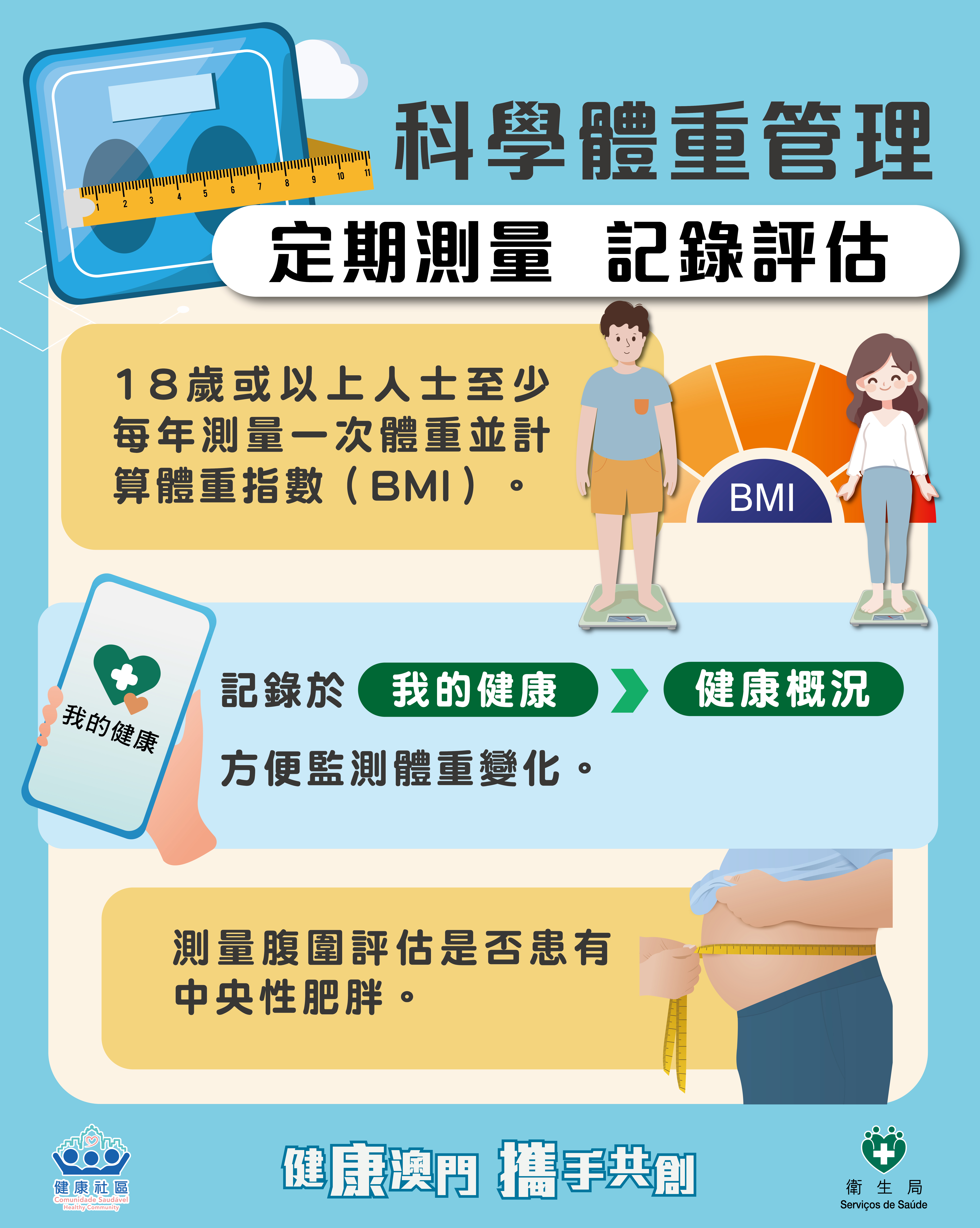 超重及肥胖與高血壓、高血糖、高血脂等慢性病密切相關,是導致心腦血管疾病、糖尿病及部分癌症的重要風險因素。超重及肥胖對各年齡層人士的身心健康均可造成深遠影響,包括兒童期會引起早發性高血壓、孕期併發症風險增加,以及成年人慢性病發病率上升等。故此,需提升居民體重管理意識和技能,預防和控制超重肥胖。衛生局提出科學體重管理4大核心要點:定期測量,記錄評估、均衡飲食,動則有益、緩減壓力,規律作息、合理目標,科學減重。衛生局建議18歲或以上人士至少每年測量一次體重並計算體重指數(BMI),定期記錄健康數據;應均衡飲食,善用碎片時間進行運動;保持睡眠充足,盡量緩減壓力;設定可達成的目標,循序漸進,例如:每週減重0.5-1公斤,避免極端方式(請參閱“科學體重管理圖文包”)。