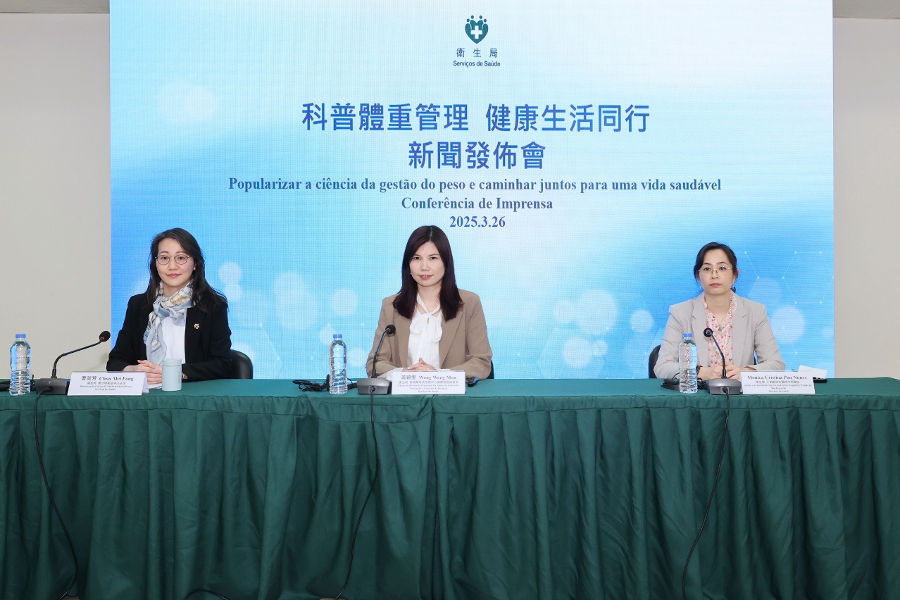 衛生局今(26)日舉行“科普體重管理 健康生活同行”新聞發佈會,介紹本澳居民體重現況及體重管理的重要性,旨在提升居民對體重管理的認識和實踐健康生活方式的能力。衛生局疾病預防及控制中心健康促進處黃穎雯處長、黑沙環衛生中心曹美芳主任及仁伯爵綜合醫院內科Monica Cristina Pon Nunes醫生共同出席了新聞發佈會。