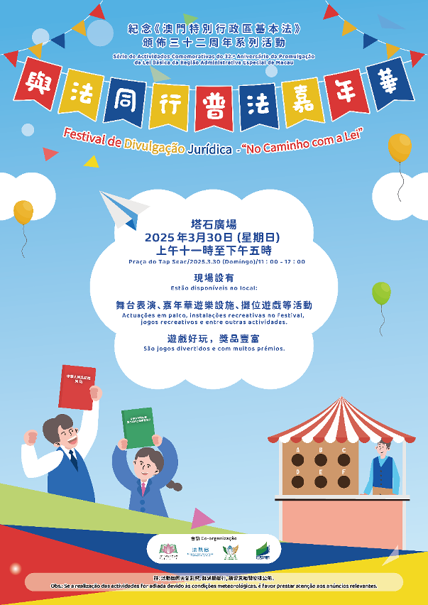 為紀念《中華人民共和國澳門特別行政區基本法》頒佈三十二周年,澳門基本法推廣協會、法務局、市政署和教育及青年發展局將於本周日(30日)上午11時至下午5時假塔石廣場合辦“與法同行-普法嘉年華”,讓市民大眾以輕鬆遊樂方式學習《澳門基本法》。