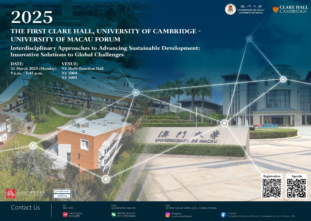 論壇將於3月31日(星期一)上午9時以英語於澳大聚賢樓多功能廳(N1-G014)舉行,並於同日下午在N1-1004及N1-1005設分論壇。詳情請瀏覽:https://ias.um.edu.mo/1st-clare-hall-cambridge-um-forum-2025/;報名地址:https://go.um.edu.mo/dwqlr2rc。查詢請致電+853 8822 2082或電郵至ias.clarehall@um.edu.mo與人文社科高等研究院聯繫。