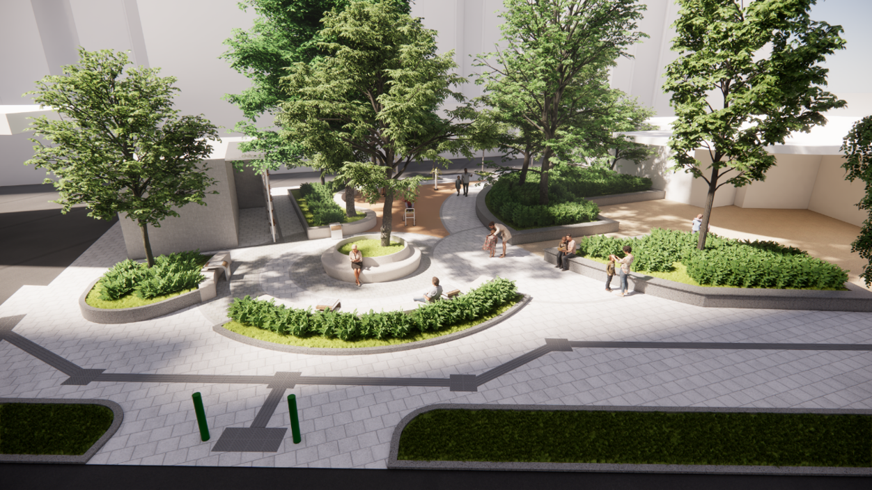 蓮花廣場休憩區,面積約7,500平方米,處於人流集中的青洲坊公屋群內,該處長期缺乏休憩康體設施。休憩區雖面積較大,但須預留足夠的消防通道,故計劃盡量利用消防通道以外空間設置遊樂、健身、廣場及閒坐區等,引入定制化遊樂及康體設施,滿足兒童及不同年齡層居民的需求。同時增加綠化和樹木種類,豐富社區綠化景觀。而區內的土地公作原地保留,並以樹木作分隔。廣場及消防通道外的街道會增加閒坐及特色遮陽設施,提升休憩區舒適度。