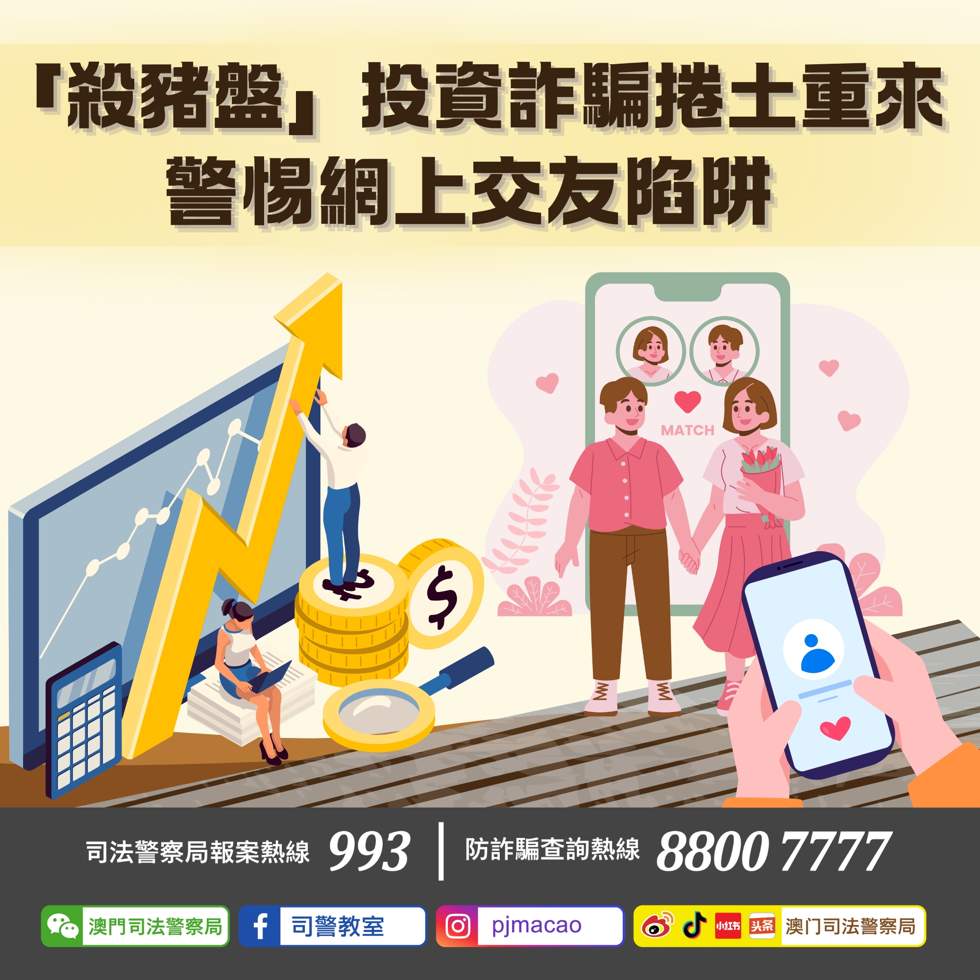 4.如有懷疑,可使用司法警察局「反詐程式」查核風險指數,或致電防詐騙查詢熱線 88007777或報案熱線993求助。