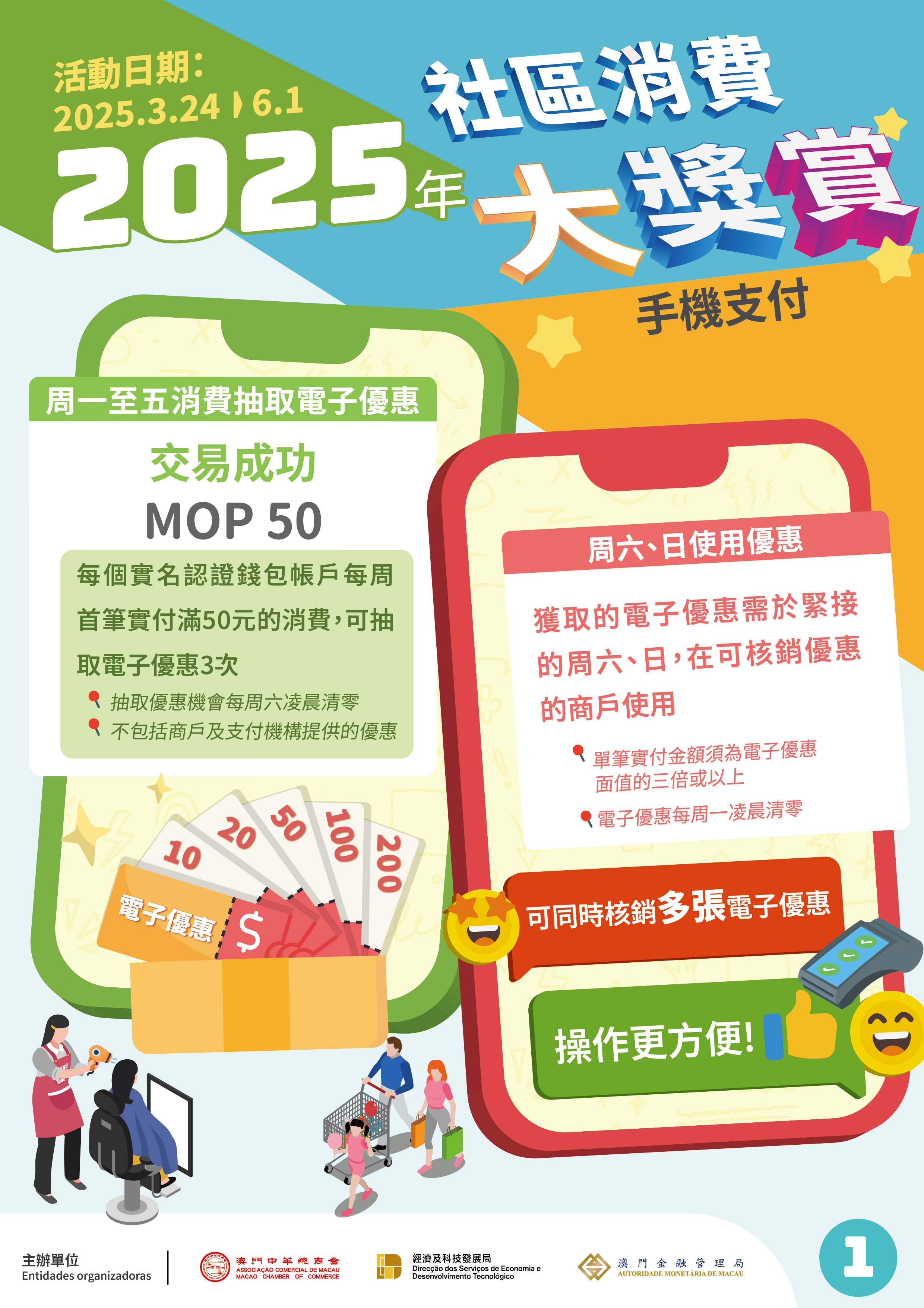 由特區政府聯同商會於3月24日至6月1日合辦為期10周的“2025年社區消費大獎賞”大型促消費活動已於日前啟動。活動期間,市民可透過移動支付消費抽取電子優惠,長者更可同時領取消費立減優惠。