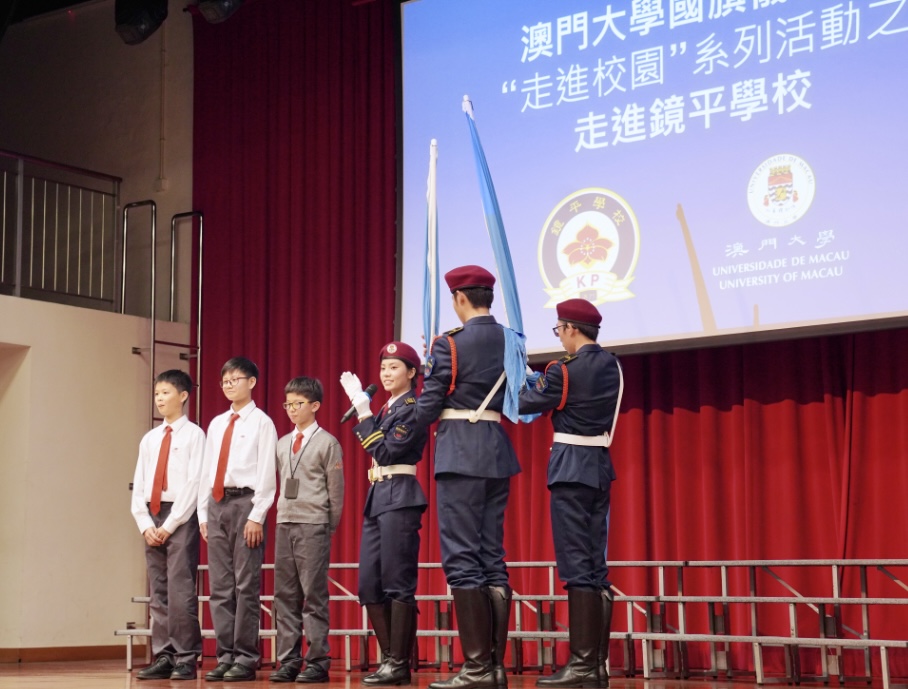澳門大學國旗儀仗隊舉辦“走進校園——鏡平學校(中學部)”國旗文化推廣及交流活動,弘揚及傳承愛國愛澳精神。