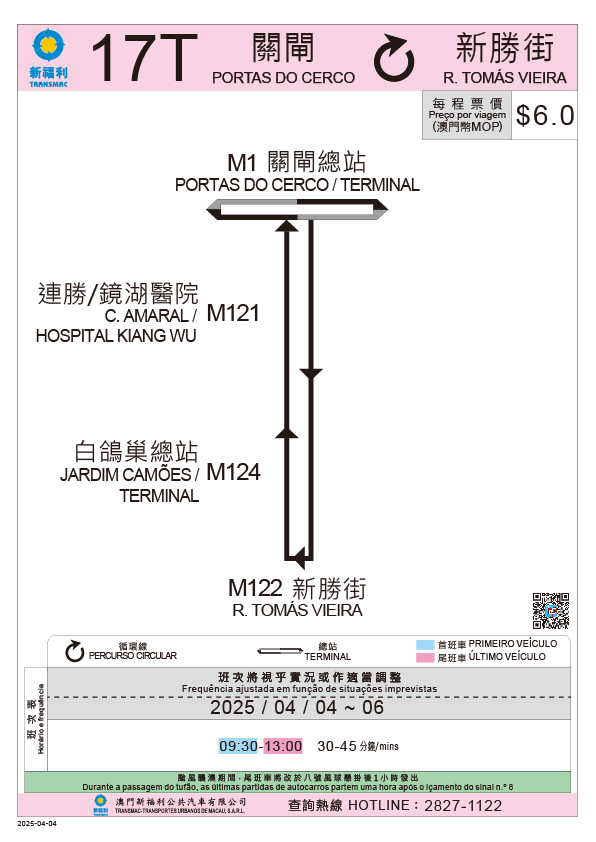因應內地清明節假日連假,為疏導客流,交通事務局提前協調兩巴在關閘廣場、路氹城一帶、媽閣交通樞紐及港珠澳大橋口岸實施時節性的巴士服務安排,兩巴於4月4日至6日指定時段營運時節性路線17T、21AT、26AT及101X特班車(101XS)路線(具體營運資料可查閱附圖),亦會派員到主要站點,維持秩序和指引乘客。此外,局方亦協調港澳跨境巴士於清明節期間加密班次,應對客流。