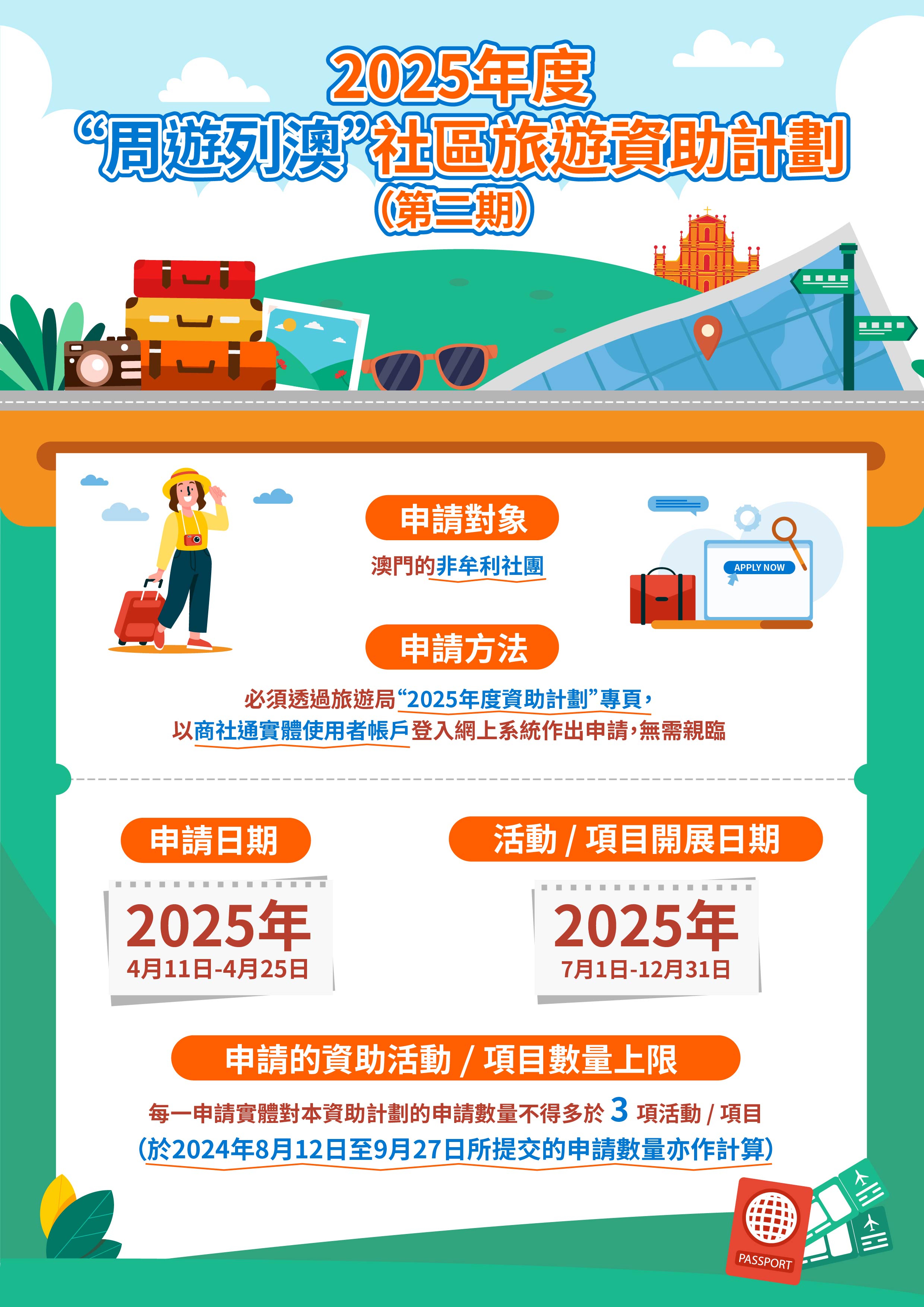 旅遊局2025年度“周遊列澳”社區旅遊資助計劃(第二期)於4月11日至25日接受申請,活動或項目須於2025年7月1日至12月31日期間舉辦,申請可透過商社通帳戶登入旅遊局“2025年度資助計劃”專頁提交。