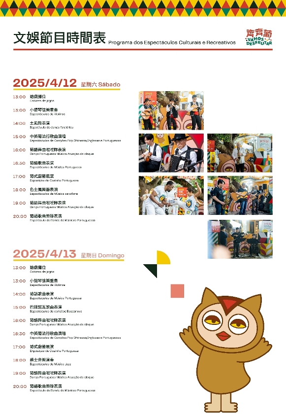 • 2025“齊齊葡-葡語國家及澳門產品特色市集”(祐漢公園站)周六及周日設有多個表演節目及藝術工作坊