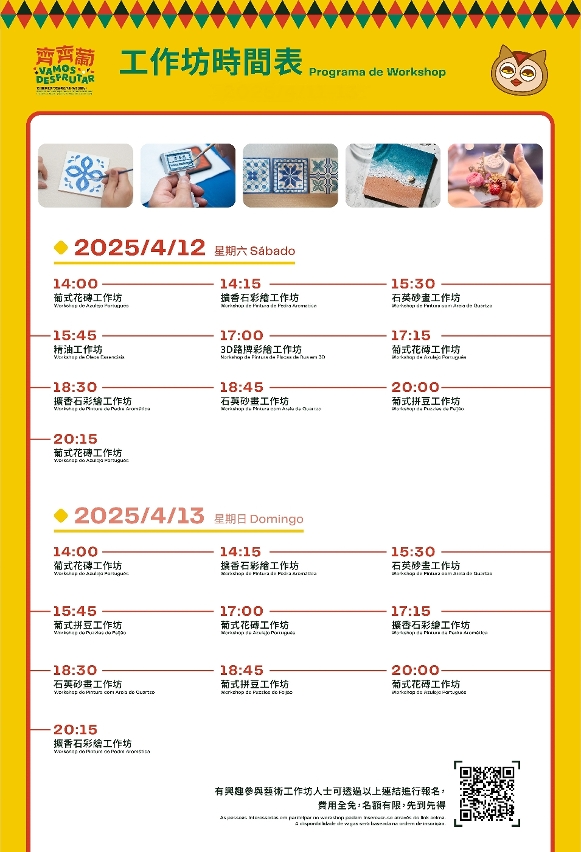 周六及周日將繼續上演葡萄牙土風舞、葡語舞曲啦啦隊、葡萄牙法多、巴西音樂巴薩諾瓦等具有葡語國家特色的歌舞;安排廚藝表演,即場進行木糠布甸、蟲仔餅等美食教學;舉辦葡式花磚、葡式拼豆、3D路牌製作等免費藝術工作坊,工作坊需事先報名,名額有限,先到先得。同時場內還設有葡式疊疊樂小遊戲、葡公鷹飛盤小遊戲以及趣味打卡裝置。內容豐富節目精彩紛呈,不容錯過。