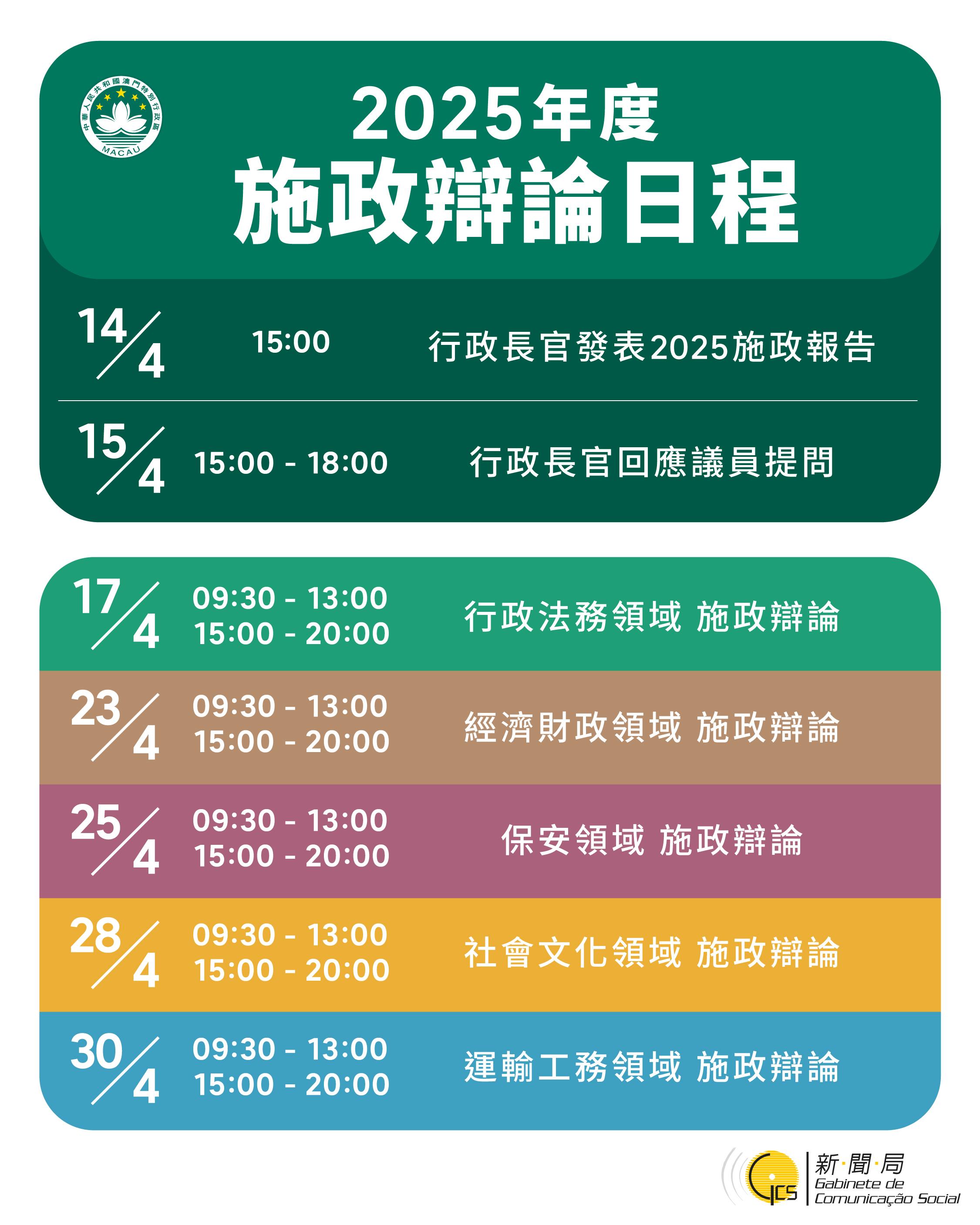 各領域施政方針的立法會辯論會議,日程分別是:4月 17日辯論行政法務領域、23日辯論經濟財政領域、25日辯論保安領域、28日辯論社會文化領域,以及30日辯論運輸工務領域施政方針。