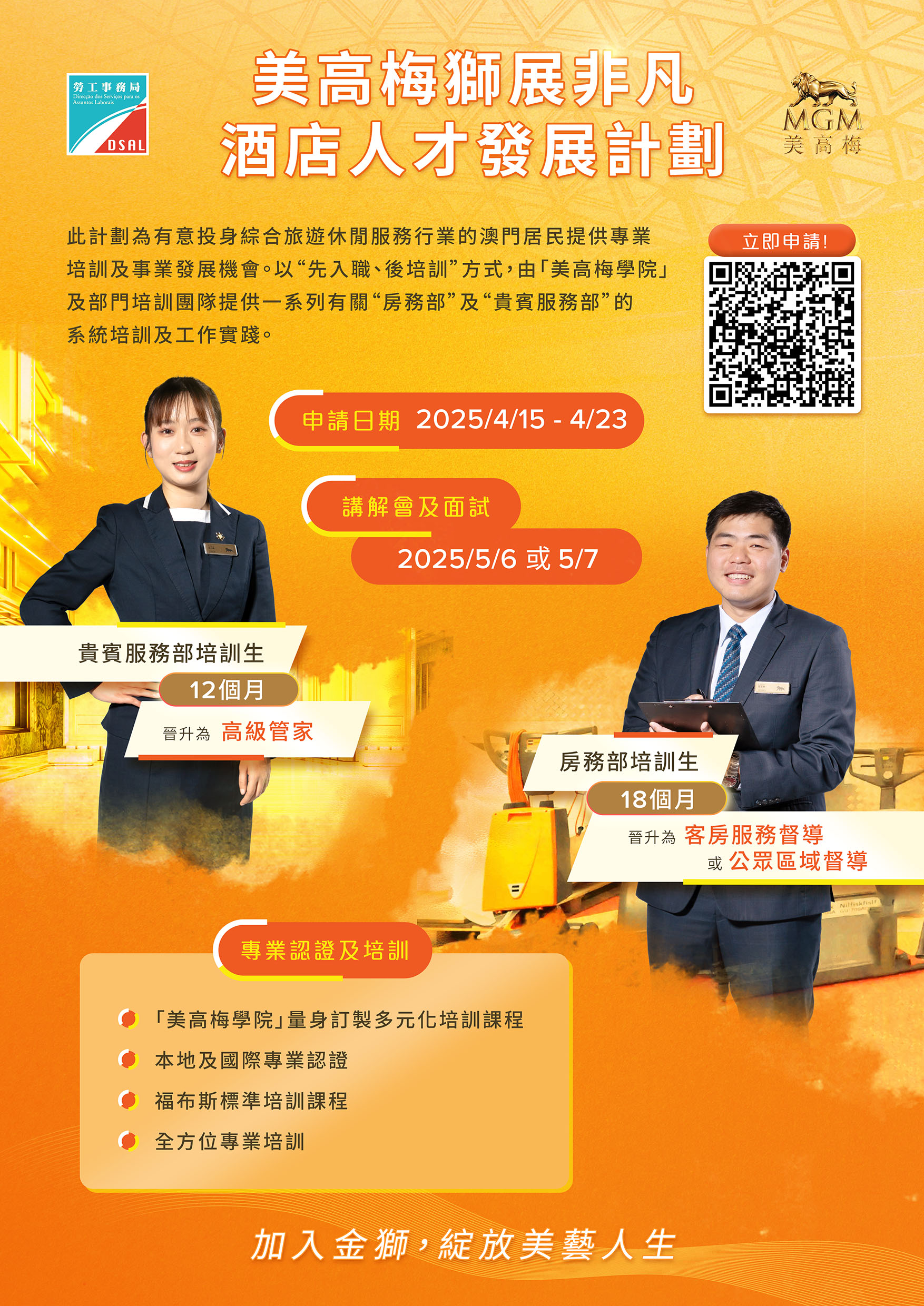 為培育本地人才,提供職業發展機會,勞工事務局(下稱“勞工局")和美高梅金殿超濠股份有限公司(下稱“美高梅”)合作推出“美高梅獅展非凡酒店人才發展計劃”(下稱“計劃”),以“先入職、後培訓”方式,為有志投身綜合休閒旅遊服務行業的澳門居民提供一系列的專業培訓及工作實踐,計劃由4月15日起接受申請。