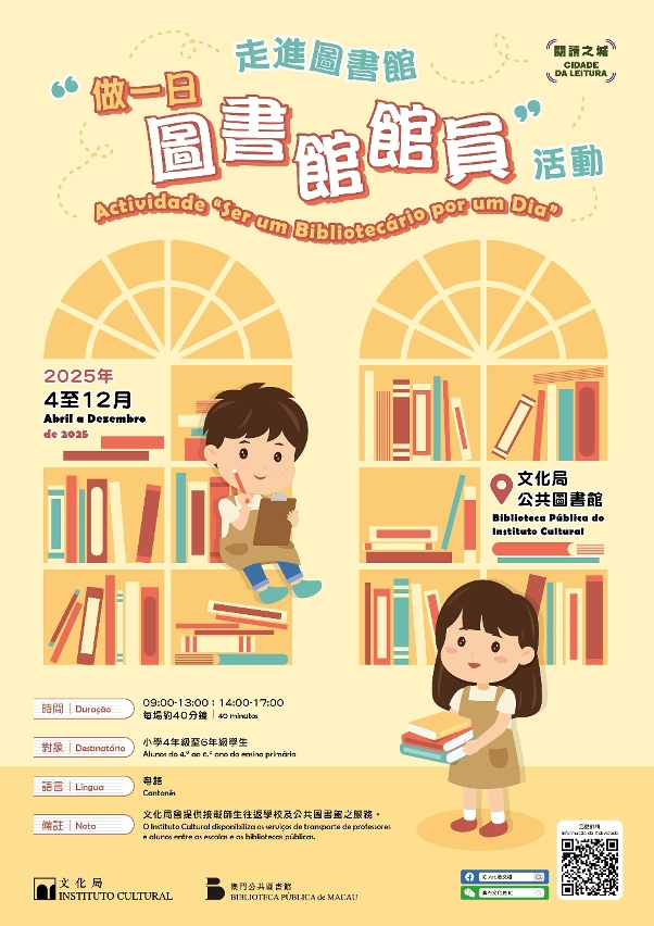 為持續推廣閱讀文化,鼓勵學生使用公共圖書館服務與資源,文化局於4月至12月期間續辦“做一日圖書館館員”活動,對象為本澳小學4年級至6年級學生,即日起接受學校報名參與,費用全免,額滿即止。
