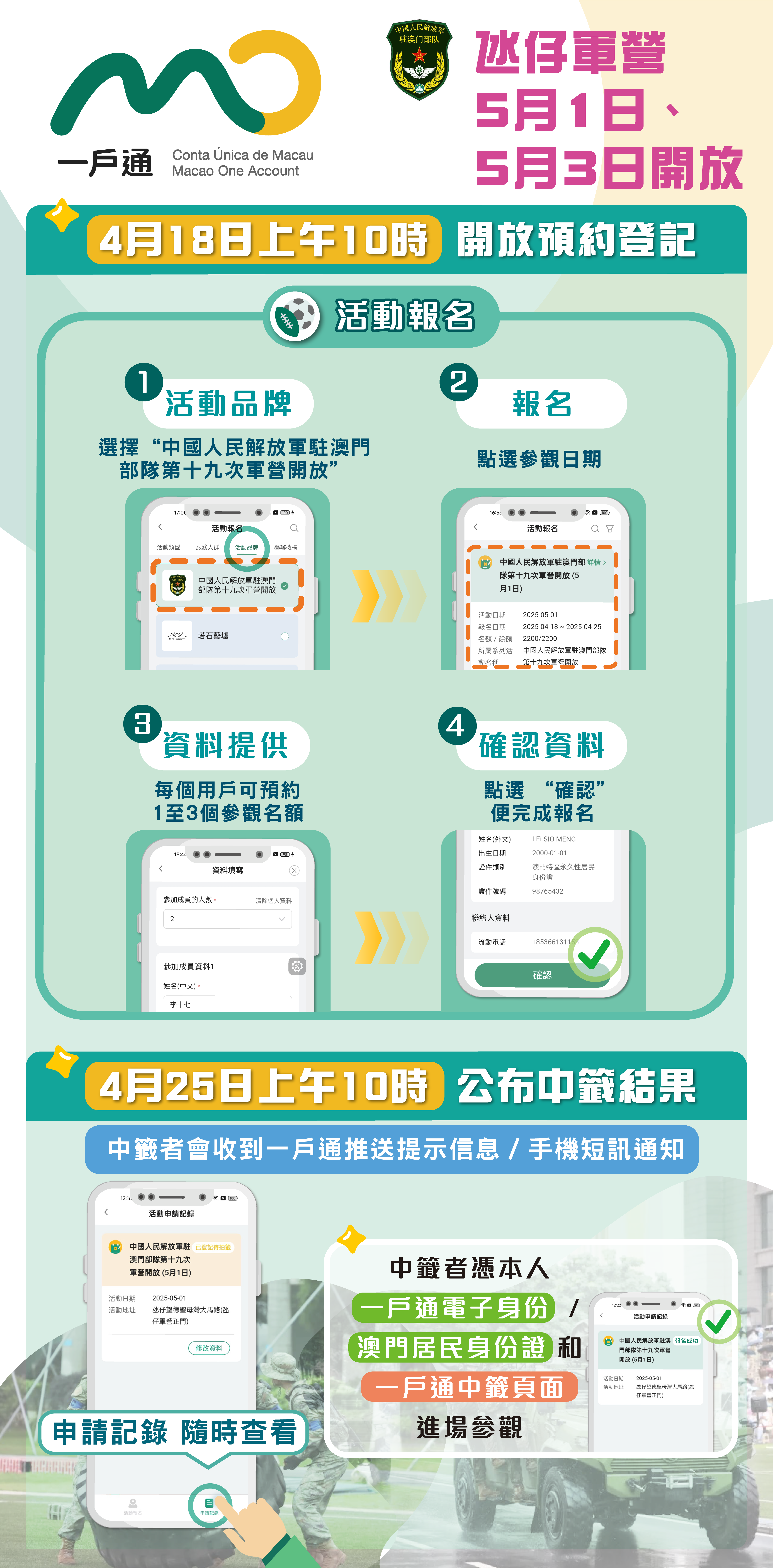 5月1日、3日參觀名額各2200個,每名“一戶通”用戶可以預約1至3個參觀名額。登記過程簡易便捷,用戶登入“一戶通”後,於“服務”中點擊“活動報名”,進入“活動品牌”頁面後,選擇“中國人民解放軍駐澳門部隊第十九次軍營開放”,選擇參觀日期並填妥相關信息,即完成預約登記。
