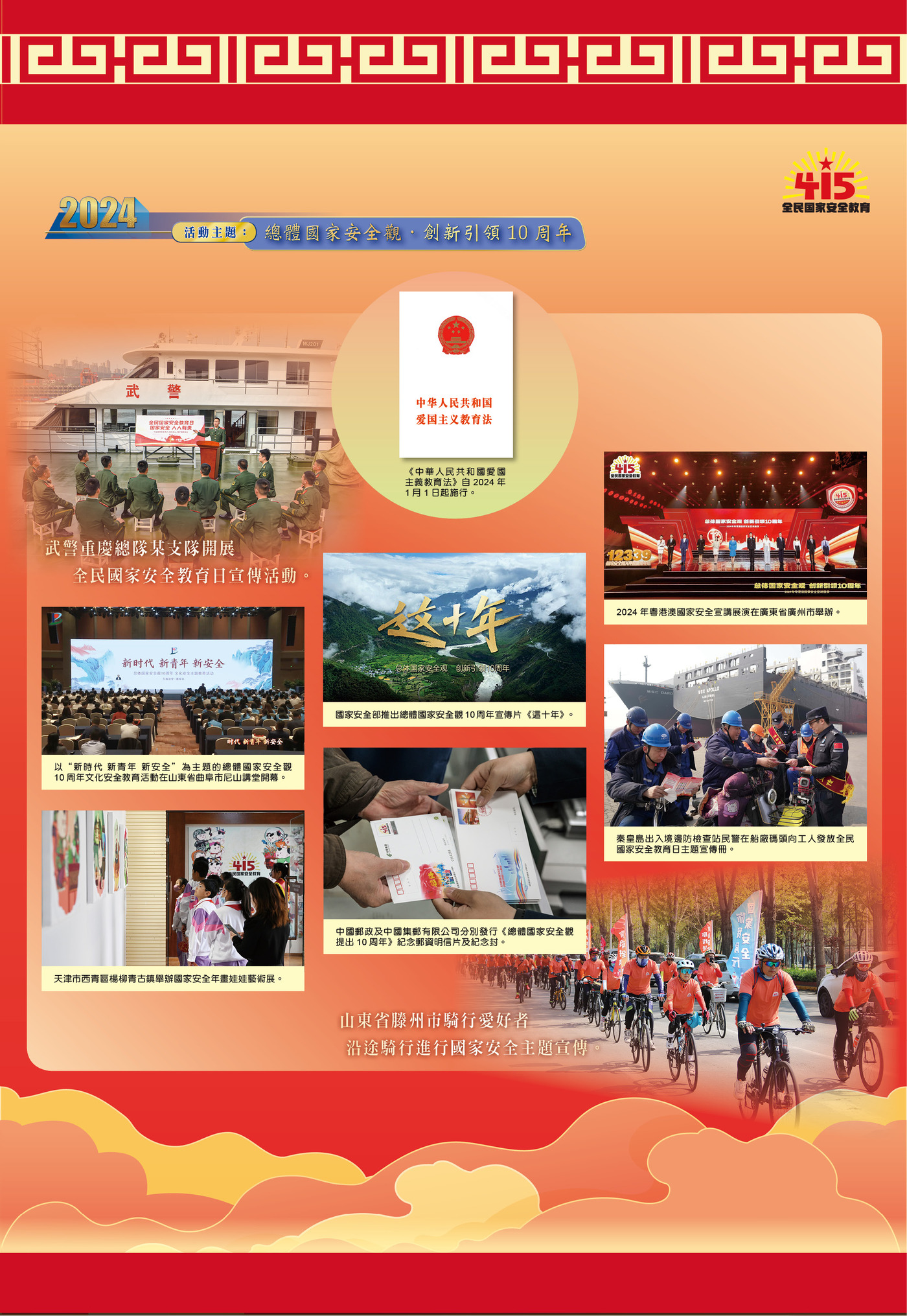 展覽第一部分“推陳出新,走深走實,掀起國安宣傳教育新熱潮”,展示了過去10年全面貫徹落實總體國家安全觀、我國國家安全工作取得歷史性成就。10年來,全國各地圍繞全民國家安全教育日活動主題,廣泛開展一系列國安宣教活動,推動“大安全”理念深入人心、落地生根。近年來,在上海、四川、海南及香港特區等地建設了一批國家安全宣傳教育基地(展館),為普及國家安全知識、增強全民國家安全意識發揮了積極作用。