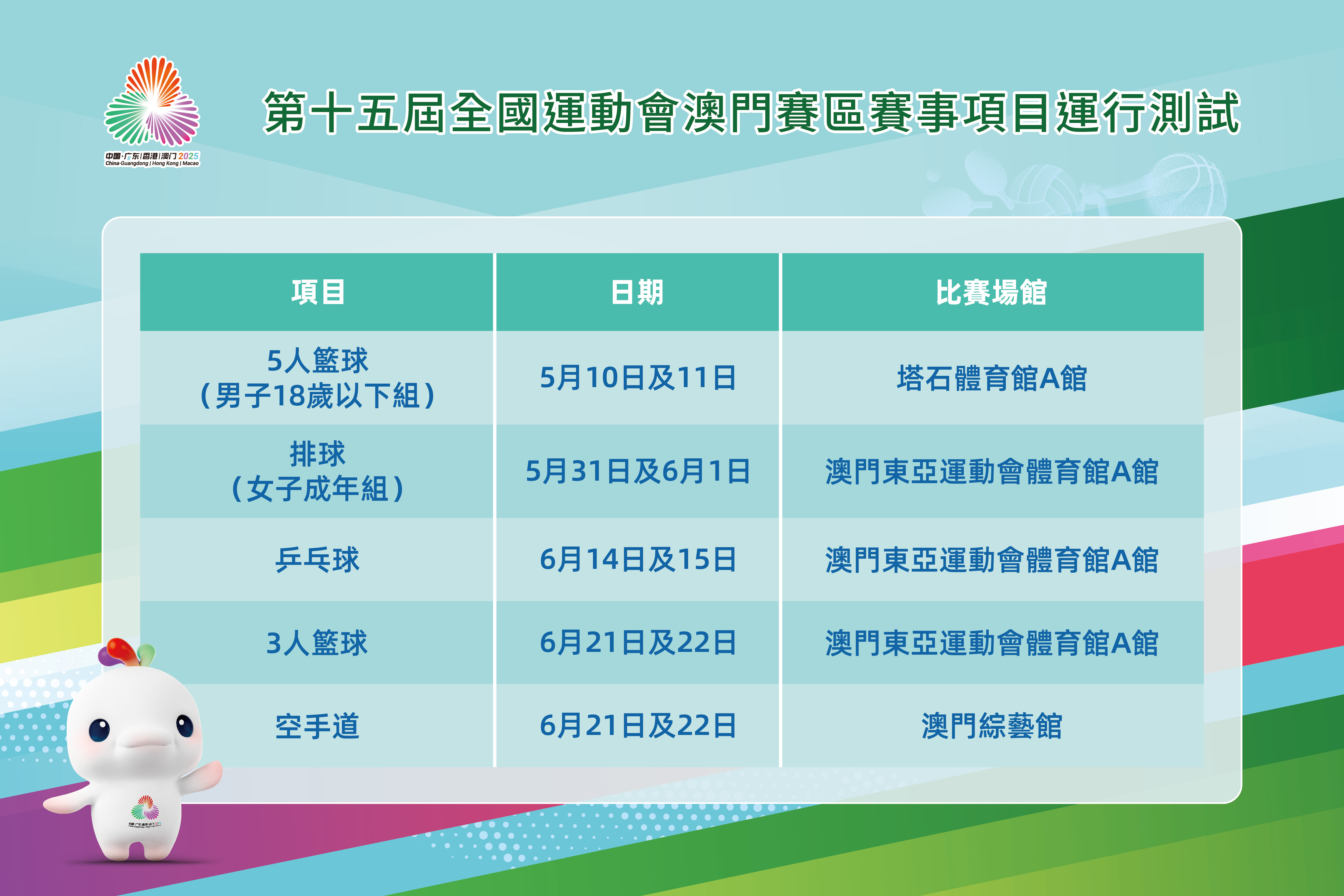 澳門賽區籌備辦副主任傅斯娜在新聞發佈會上介紹各項目運行測試的安排,當中,5人籃球(男子18歲以下組)將於5月10日及11日在塔石體育館A館舉行;排球(女子成年組)將於5月31日及6月1日在澳門東亞運動會體育館A館舉行;乒乓球將於6月14日及15日在澳門東亞運動會體育館A館舉行;3人籃球和空手道則同樣於6月21日及22日舉行,地點分別是澳門東亞運動會體育館A館和澳門綜藝館。而參與項目測試的隊伍由內地及本澳隊伍組成,期間將開放予澳門市民及旅客進場參與,提前感受全運會的氣氛。有關門票派發等安排將稍後公佈,敬請留意。