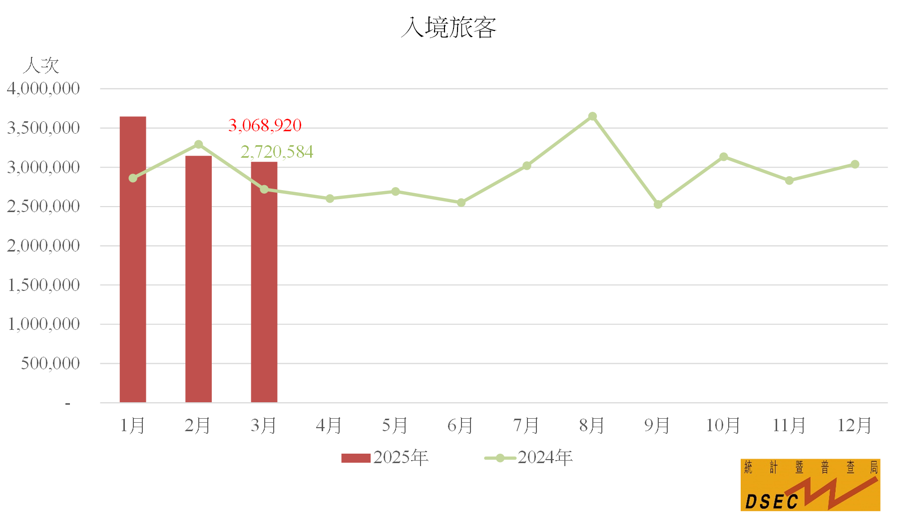 2025年3月入境旅客共3,068,920人次,按年上升12.8%;不過夜旅客(1,780,279人次)及留宿旅客(1,288,641人次)分別增加23.3%及0.9%。旅客平均逗留時間較去年同期減少0.1日至1.1日;不過夜旅客(0.2日)與留宿旅客(2.3日)的均維持不變。