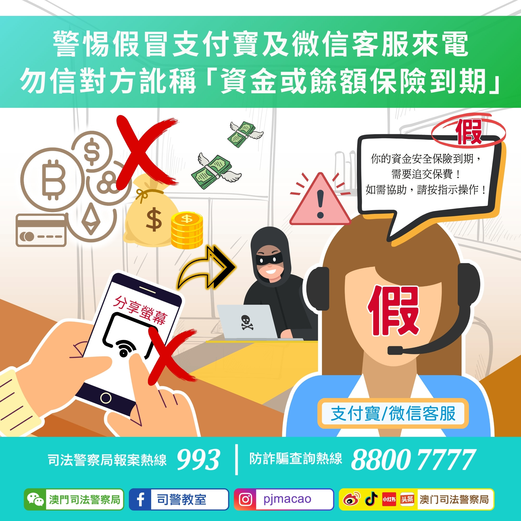 - 如有懷疑,可使用司警局的“反詐程式”查核風險指數、上報可疑涉詐訊息,或致電防詐騙查詢熱線88007777或報案熱線993求助。