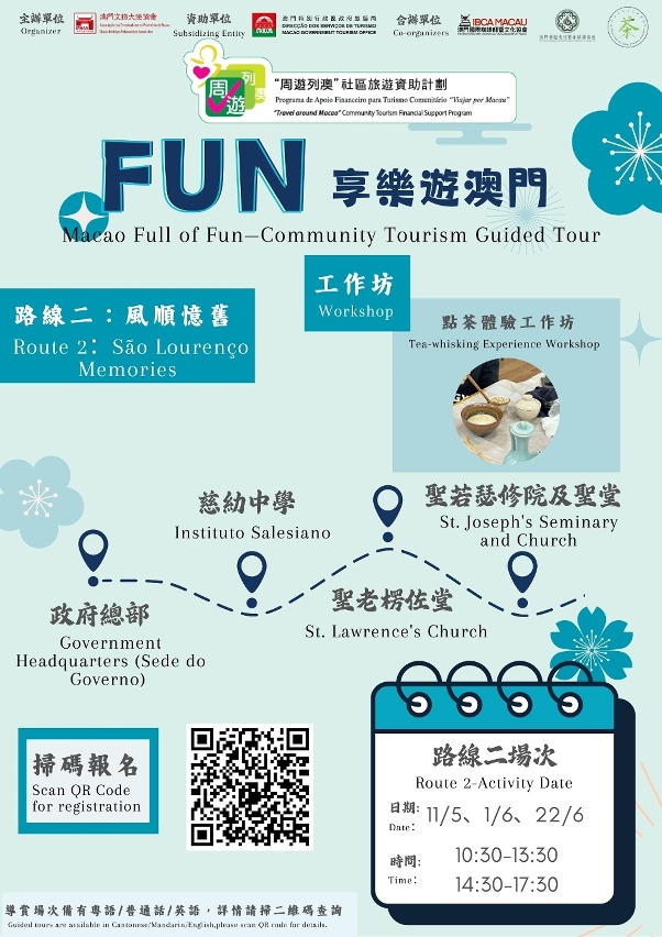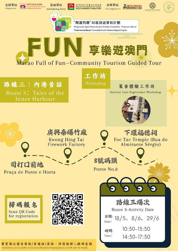 “FUN享樂遊澳門—社區旅遊駐點導賞服務”於5月4日至6月29日一連九個週日舉辦共18場導覽。活動設3條路線:“流金歲月”路線帶領參加者深入東方基金會及基督教墳場等,探索澳門貿易發展歷程;“風順憶舊”路線讓參加者遊歷聖老楞佐堂、聖若瑟修院大樓及聖堂等,探尋澳門的獨特歷史與西方信仰;“內港昔話”路線則讓居民及旅客“穿越”到澳門工業時代,走訪廣興泰炮竹廠及8號碼頭等,了解昔日的工業與商貿故事。每場活動備有廣東話、普通話或英語導賞,亦設3D立體咖啡拉花、點茶或篆香體驗工作坊,豐富參加者體驗。