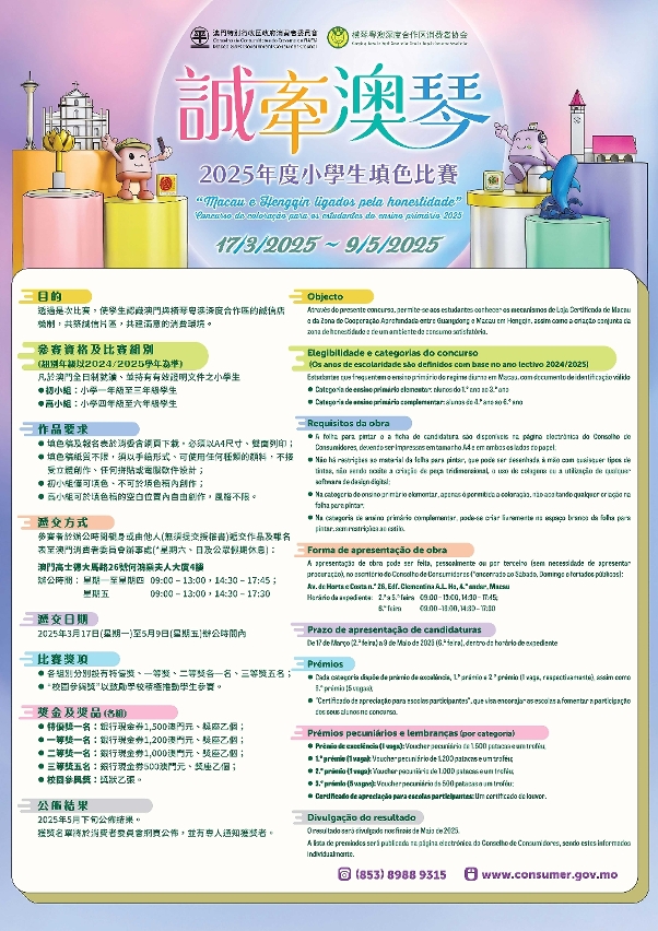 “誠牽澳琴”2025年度小學生填色比賽澳門區章程及報名表、填色稿可於消委會網頁(https://www.consumer.gov.mo)下載,作品完成後須於5月9日或之前遞交至消委會辦事處(高士德大馬路26號何鴻燊夫人大廈4樓)。