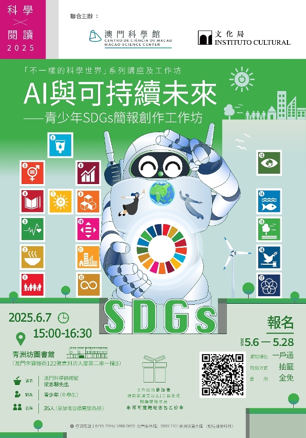 文化局與澳門科學館多年來攜手舉辦“科學 x 閱讀”系列活動,今年率先推出全新主題——“AI 與可持續未來——青少年 SDGs 簡報創作工作坊”,即日起至5月28日於一戶通接受報名,活動費用全免,歡迎本澳中學生踴躍參加。