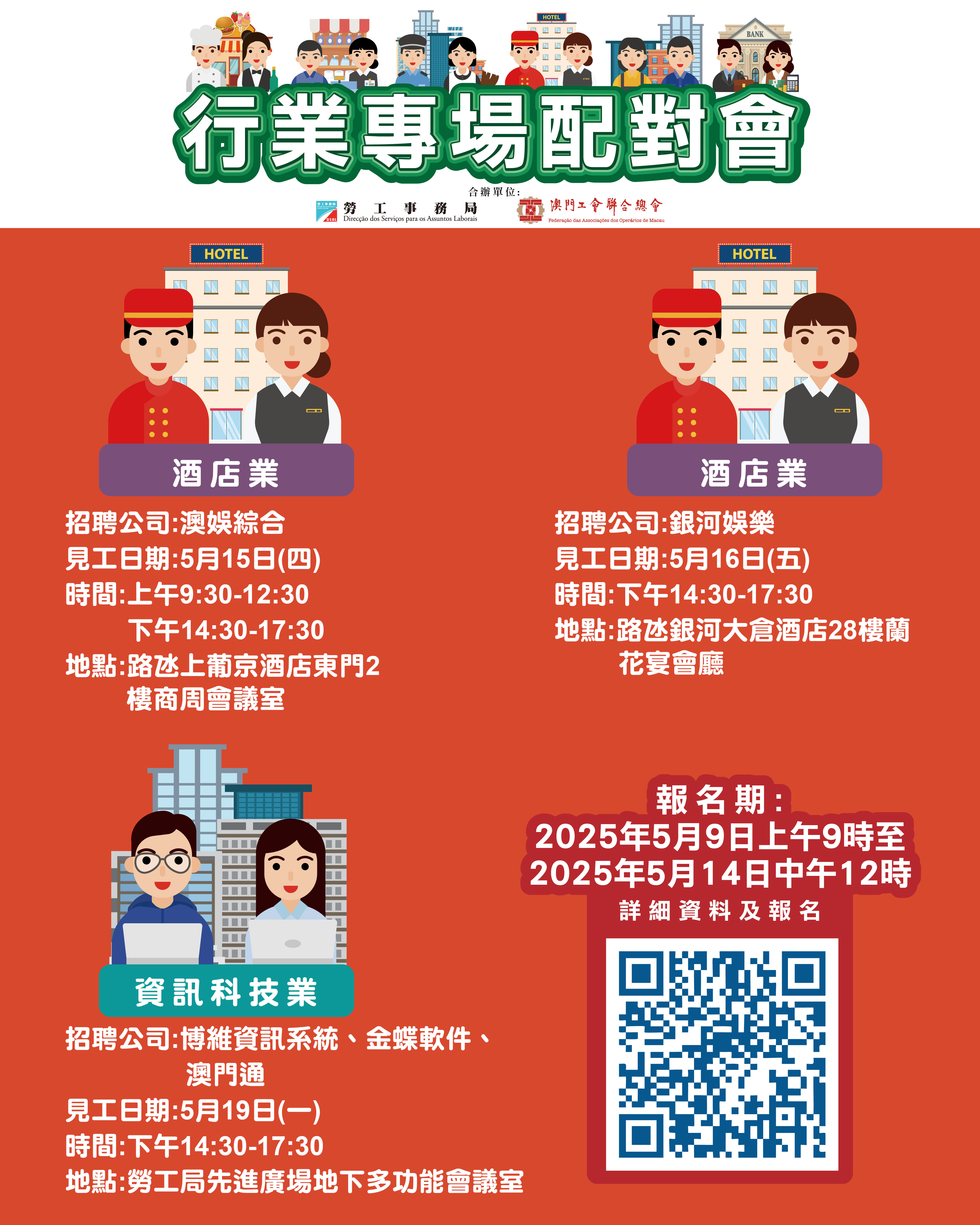 5月15日全日酒店業配對會在澳門上葡京二樓商周會議室舉行;5月16日下午酒店業配對會在澳門大倉酒店28樓蘭花廳舉行;5月19日下午資訊科技業專場配對會在澳門勞工事務局地下多功能會議室(澳門馬揸度博士大馬路221-279號先進廣場大廈)舉行。報名日期為5月9日上午9時至5月14日中午12時。