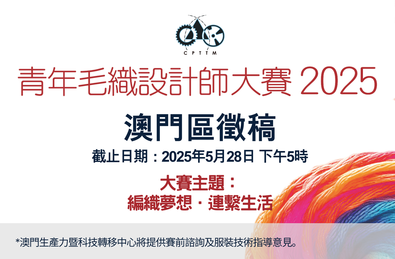 由毛織創新及設計協會、香港毛織出口廠商會及香港羊毛化纖針織業廠商會合辦,澳門生產力暨科技轉移中心擔任支持機構的“青年毛織設計師大賽2025”,於早前開始接受報名,澳門地區的截止交件日期將延至5月28日,歡迎有興趣人士把握機會參賽。