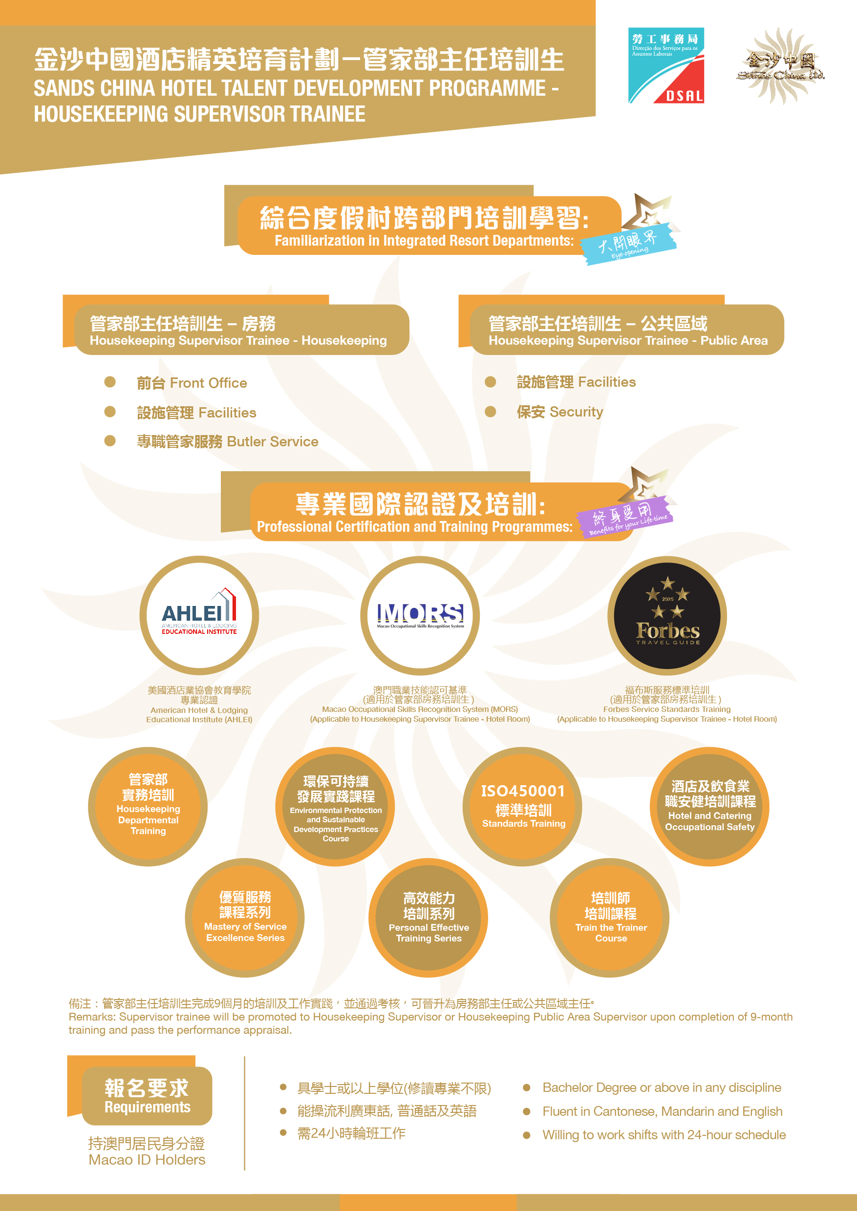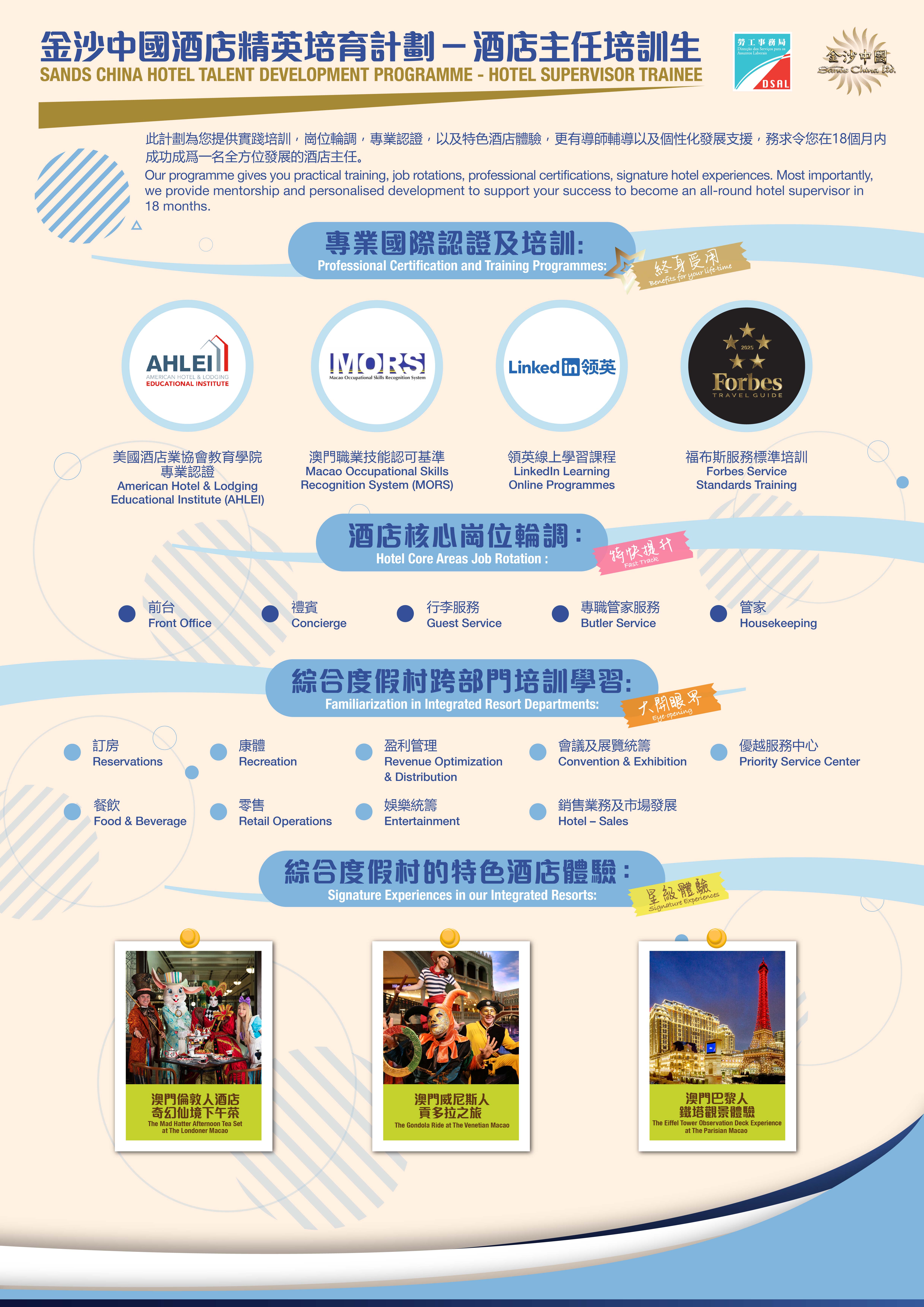 計劃提供酒店主任培訓生(前台/禮賓)職缺16個、管家部主任培訓生(房務/公共區域)職缺16個,合共32個職缺。獲錄取參加計劃者,金沙中國將安排專業培訓及工作實踐。培訓內容包括酒店營運部門理論知識與實操培訓、綜合度假村跨部門培訓學習、福布斯服務標準培訓,以及考取美國酒店業協會教育學院專業認證及澳門職業技能認可基準(MORS)等。