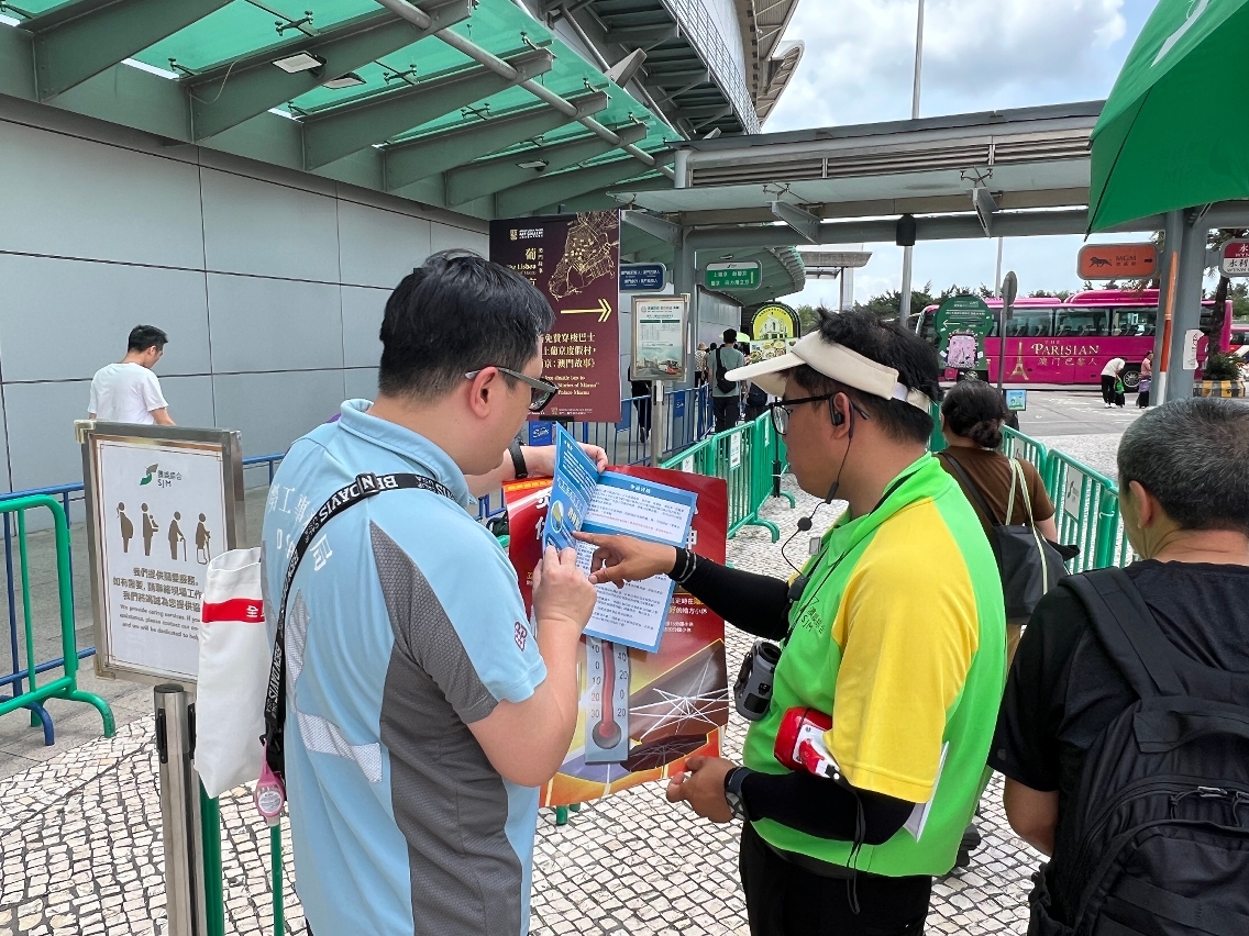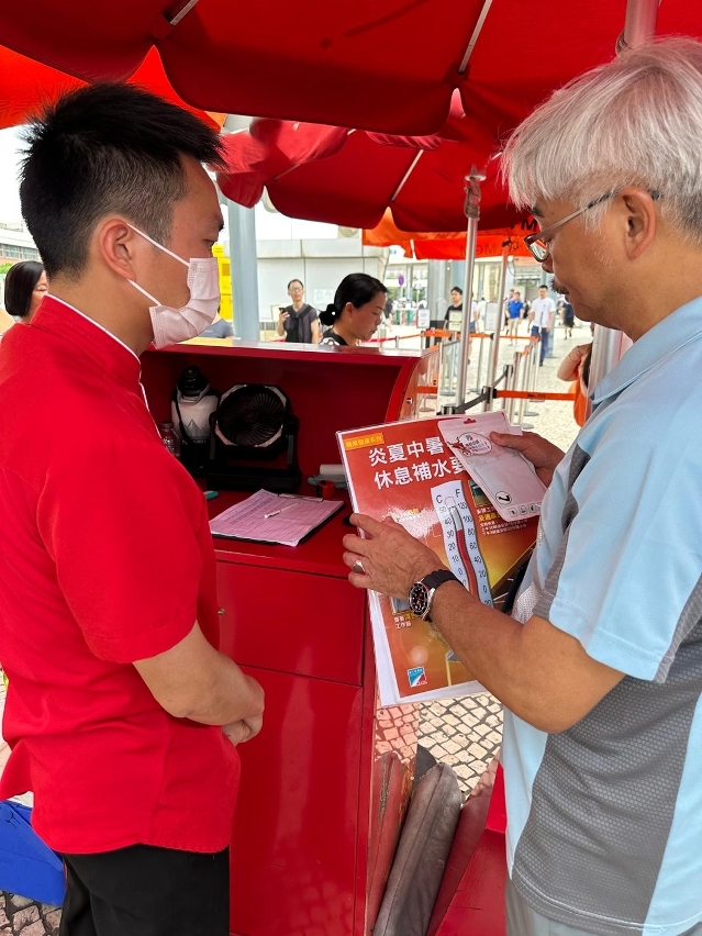 此外,勞工局於5月派員到全澳各區的戶外工作地點,包括建築工地、道路工程、園林綠化、旅遊巴士站等多個工作地點進行預防中暑的職安健巡查宣導活動。在活動期間,勞工局人員向戶外工作的工友講解預防中暑知識,提醒工作人員適時補充水份,並留意身體狀況。同時,亦向現場僱主呼籲在酷熱天氣下,應留意戶外工作環境和溫度變化,合理安排僱員輪換工作,安排長時間在高溫和濕度高的環境下工作的僱員,適時在陰涼及通風良好的地方小休。勞工局亦向戶外工作的僱員派發防中暑物資,包括:抗熱服、防曬帽套、防曬手袖及水樽等,以提高僱主及僱員對預防中暑的認知。