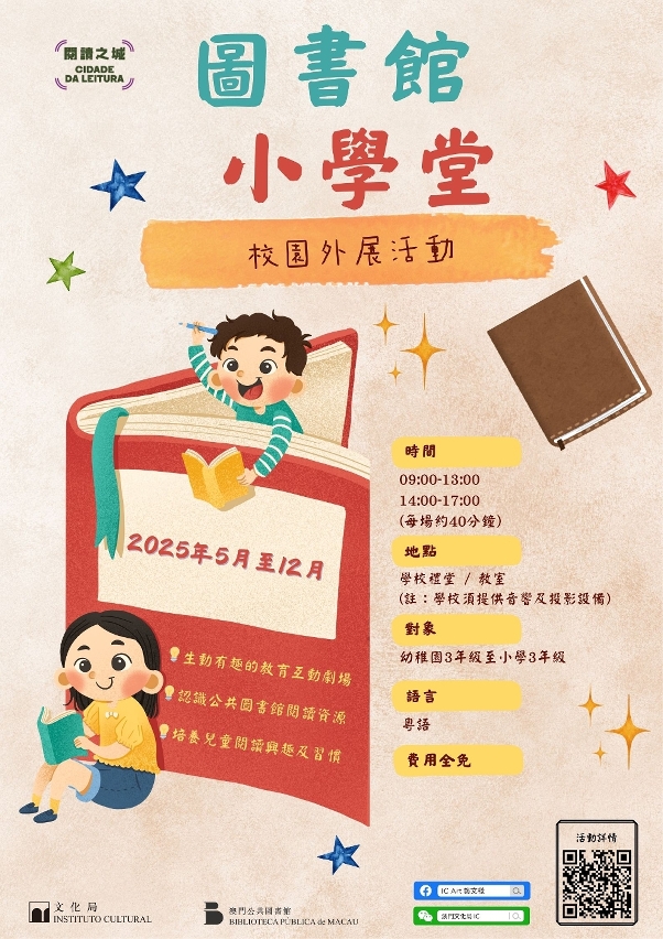 活動以粵語進行,每場時間約40分鐘,共40場,歡迎有興趣的學校於即日起至7月4日下午6時前報名參與。活動章程及報名表可於文化局公共圖書館網頁www.library.gov.mo瀏覽及下載,查詢可於辦公時間致電文化局讀者服務及推廣處8598 6664凌小姐或8598 6663楊小姐。