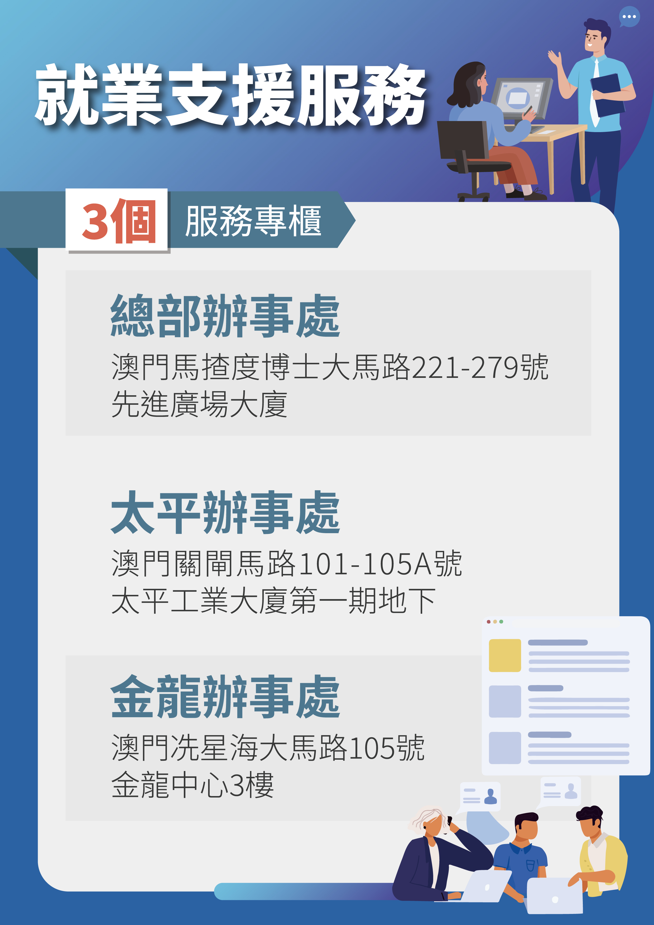 此外,相關部門亦已推出支援熱線,包括博彩監察協調局(28569262)、經濟及科技發展局(85972288)、金融管理局(28568856),方便有需要的居民進行查詢。