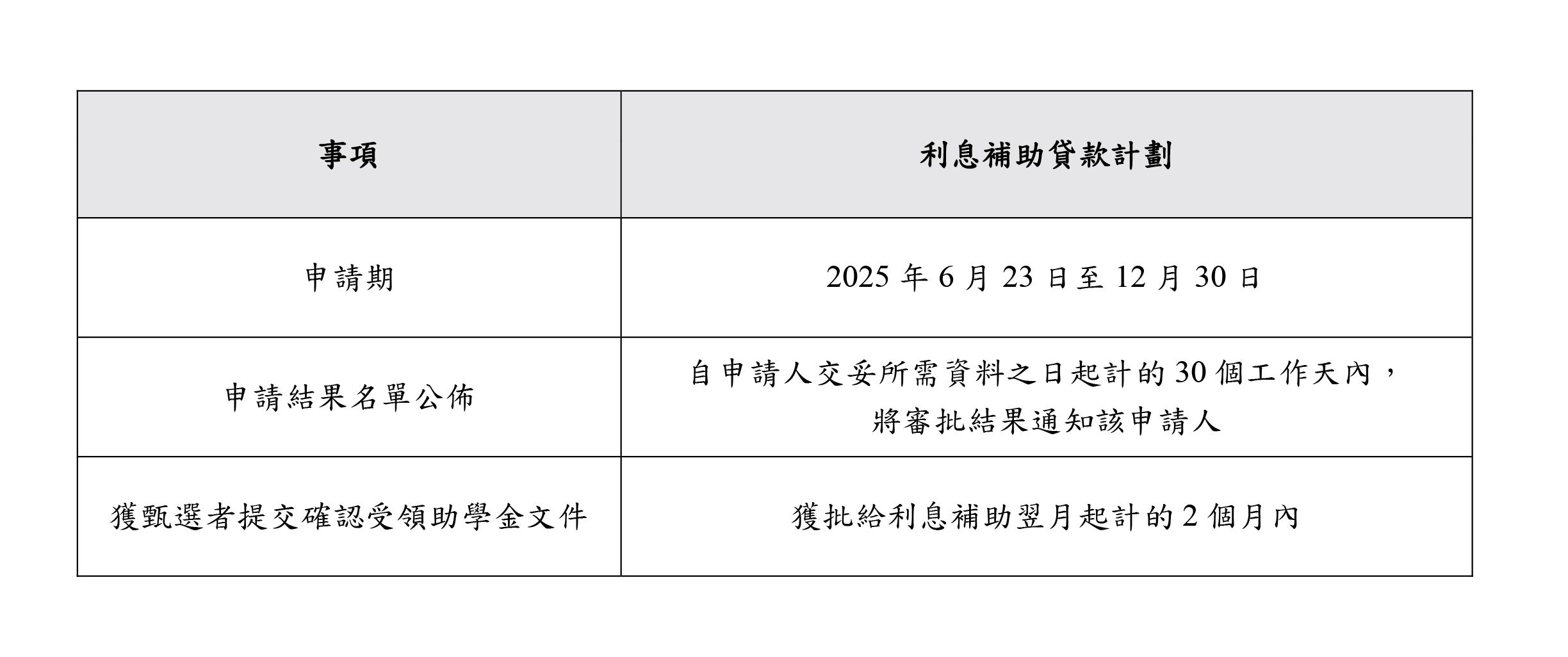 “利息補助貸款計劃”申請期為6月23日至12月30日,資助對象為升讀由高等教育機構開辦的預科課程,以及學士或以下程度的高等教育課程的申請人,並需先向參與該計劃的信用機構申請升學貸款,教育基金將向獲批給貸款且符合條件的受資助者發放相關貸款的利息補助;受資助者在學期間每月可獲發放一期利息補助,利息補助期數上限相當於受資助者尚餘的最短修讀年期的12倍,倘受資助者的補助期完結或受資助者完成獲補助課程,則其利息補助期亦隨之完結,並以較早者為準。