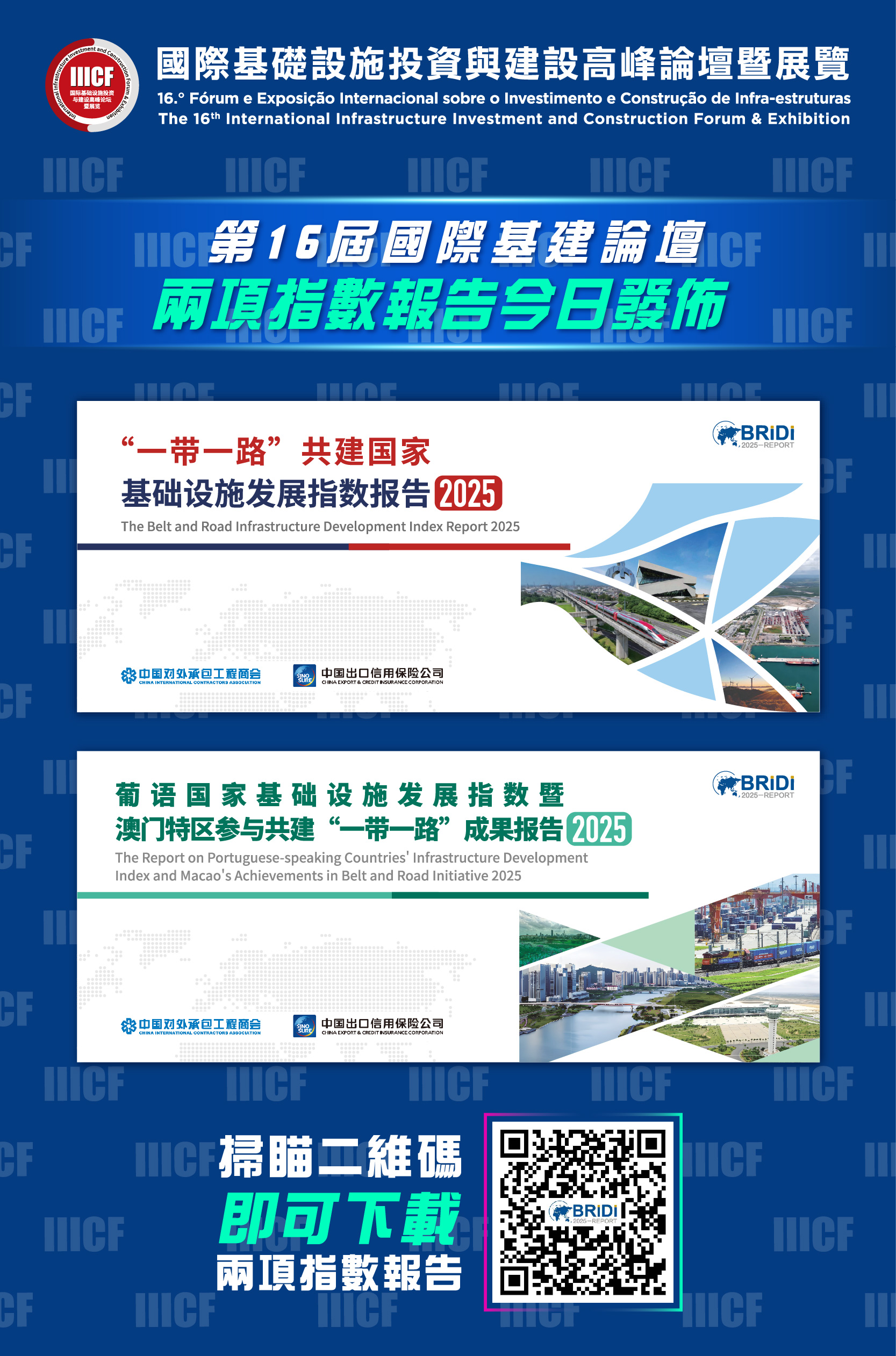 《“一帶一路”共建國家基礎設施發展指數報告(2025)》及《葡語國家基礎設施發展指數暨澳門特區參與共建“一帶一路”成果報告(2025)》於今(11)日在“第16屆國際基礎設施投資與建設高峰論壇暨展覽”重磅發佈,推動參與和助力高質量共建“一帶一路”,發揮澳門作為中國與葡語國家“精準聯繫人”的角色。
