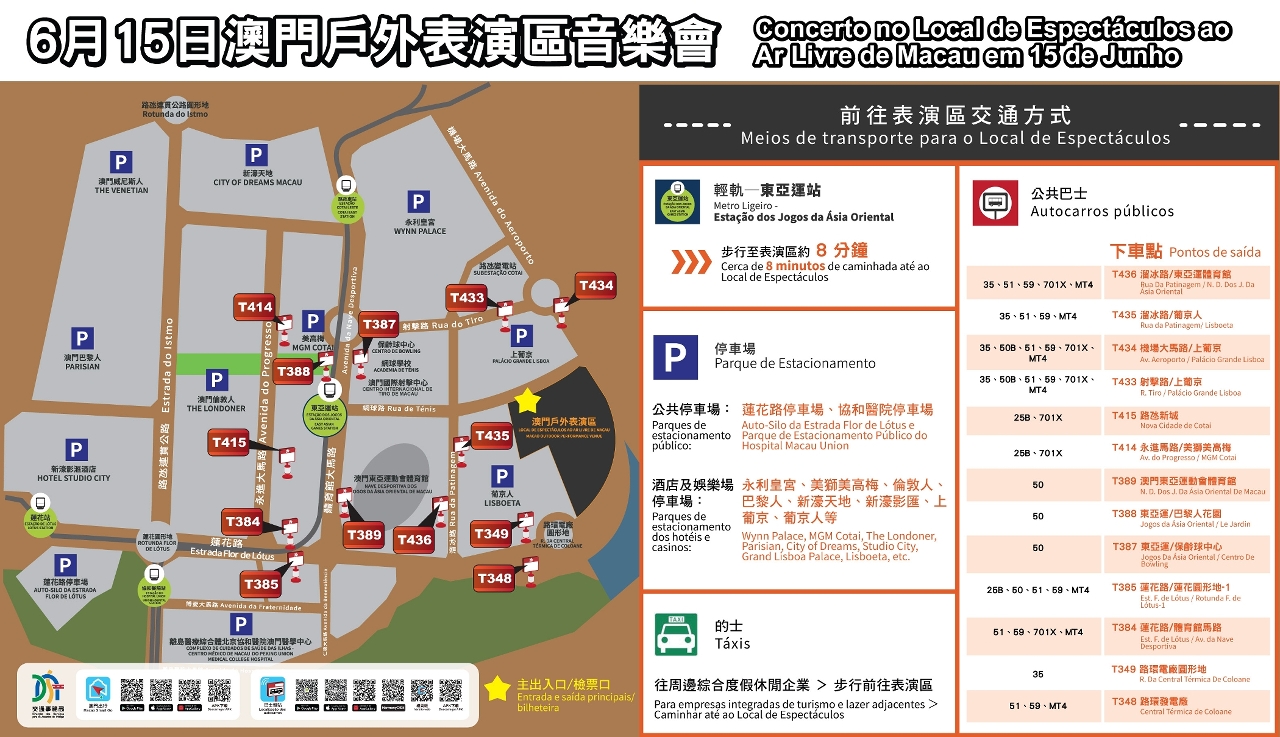 局方呼籲公眾提前瀏覽交通事務局網頁(www.dsat.gov.mo)了解演出當天各項臨時交通安排資料,並透過“澳門出行”手機應用程式、交通事務局微信公眾號(macaudsat、macau-dsat)留意最新交通消息;有關巴士及輕軌服務詳情,請留意兩巴網站(澳巴:www.tcm.com.mo、新福利:www.transmac.com.mo)及輕軌公司網頁(https://www.mlm.com.mo)。
