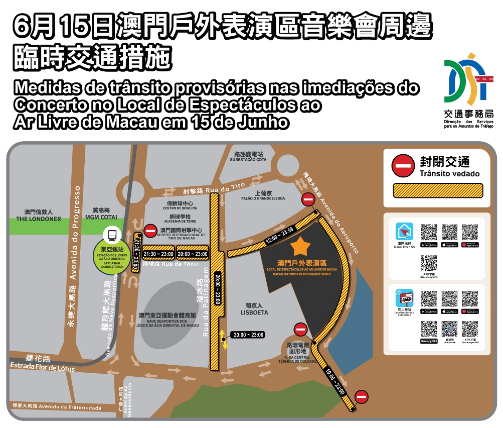 交通事務局經與多方協調,將因應澳門戶外表演區6月15日之大型演出活動實施多項臨時交通安排(具體請查閱附圖),請公眾屆時留意現場交通指示標誌,並遵守現場交通警員的指揮及安排。同時,建議公眾盡量使用公共交通及集體運輸工具出行,並提醒市民留意最新之交通、天氣及主辦方公佈之資訊,提早規劃行程。